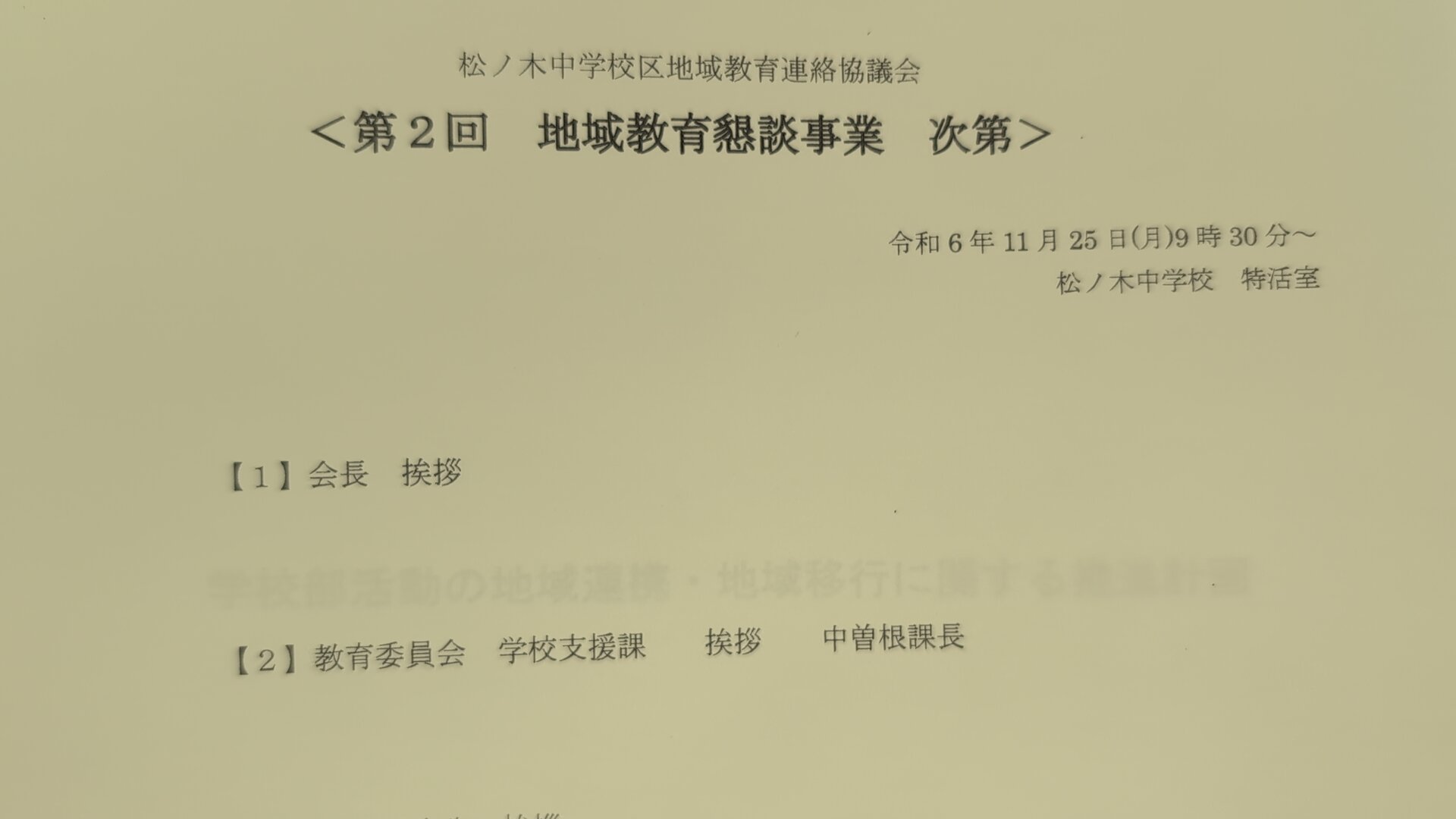 地域教育懇談事業 学校全体 コピー 2024.11.252025.06.24 本日は松ノ木中学校にて、地域の方、教育関係者などが集まり、松ノ木中学校区の地域事業について話し合いをしました。 今回は特に部活動についての話し合いを行いました。 様々な方が想いと知恵を寄せ合い、地域が成り立っています。