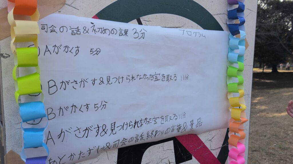 司会者は事前に準備をして、スムーズな進行になるよう台本を作っていました。チームもしっかり分かれ、宝も準備し、ルールも事前に周知・理解されています。
