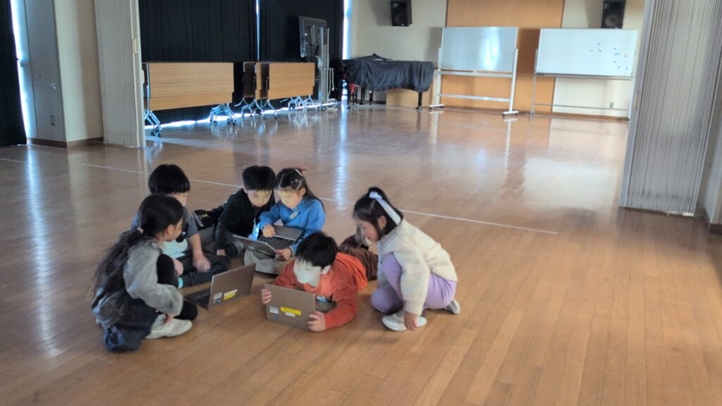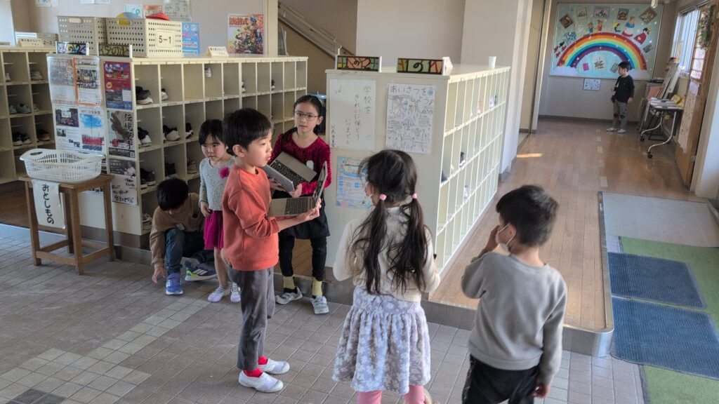 1年生がタブレットを持って廊下を歩いているので、声をかけたところ、「お楽しみ会をしています!」とのこと。