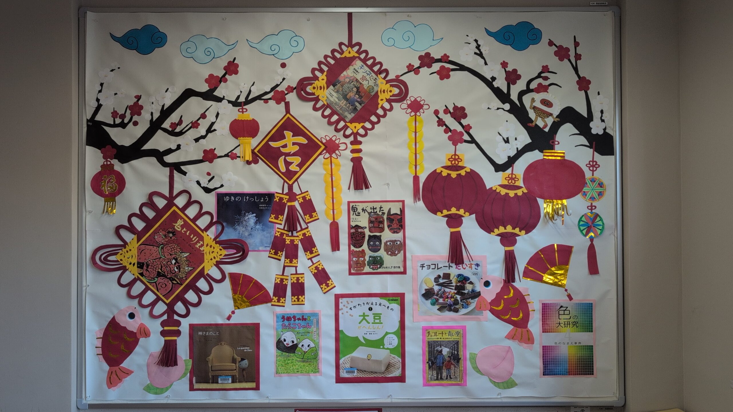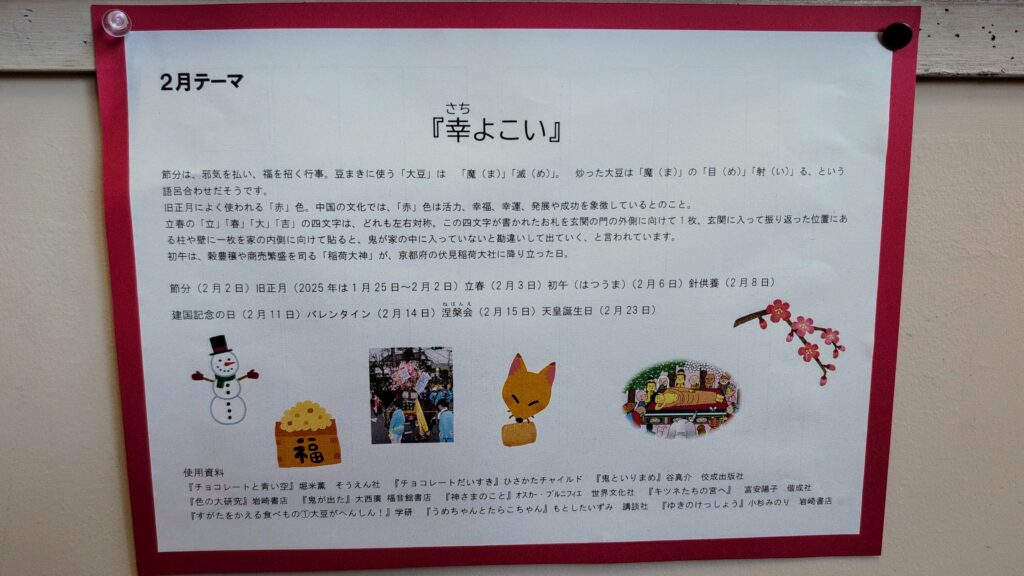 2月の図書ボランティアさんによる壁掲示は「幸よこい」です。