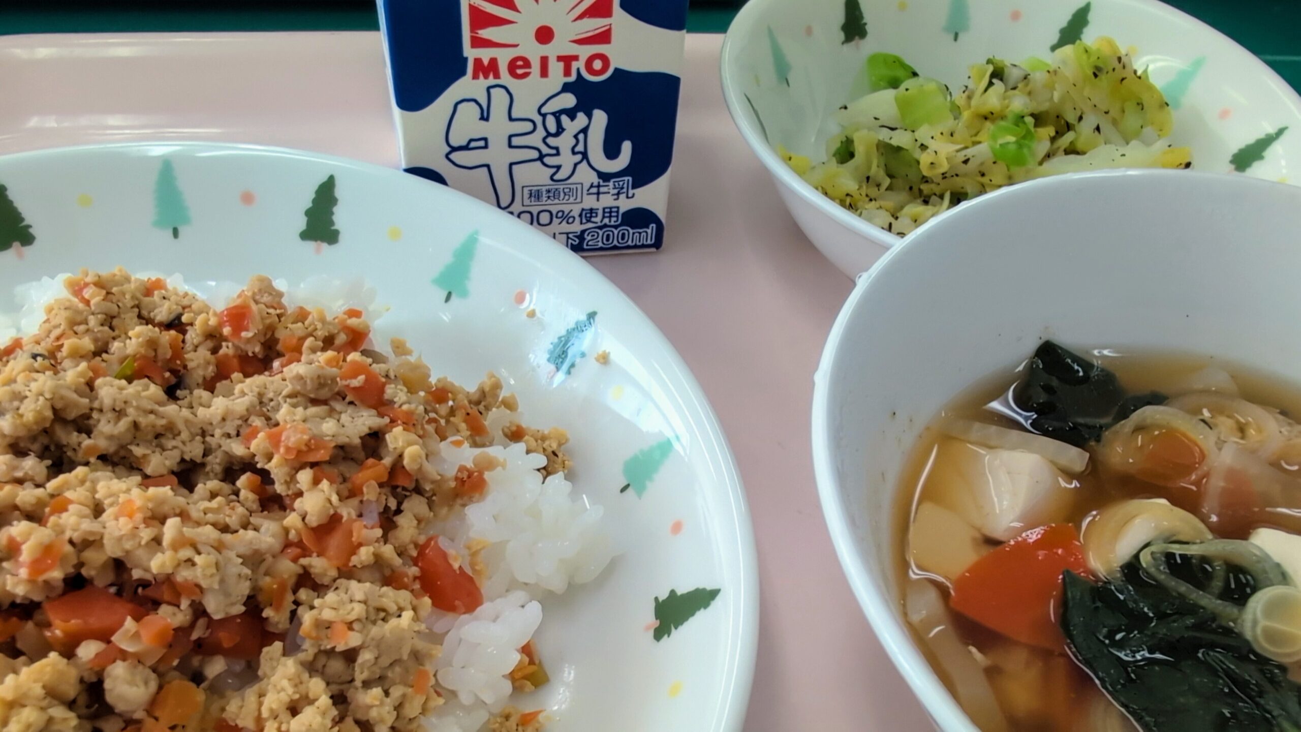 高野豆腐のそぼろご飯、のっぺい汁、ゆかりキャベツ、牛乳