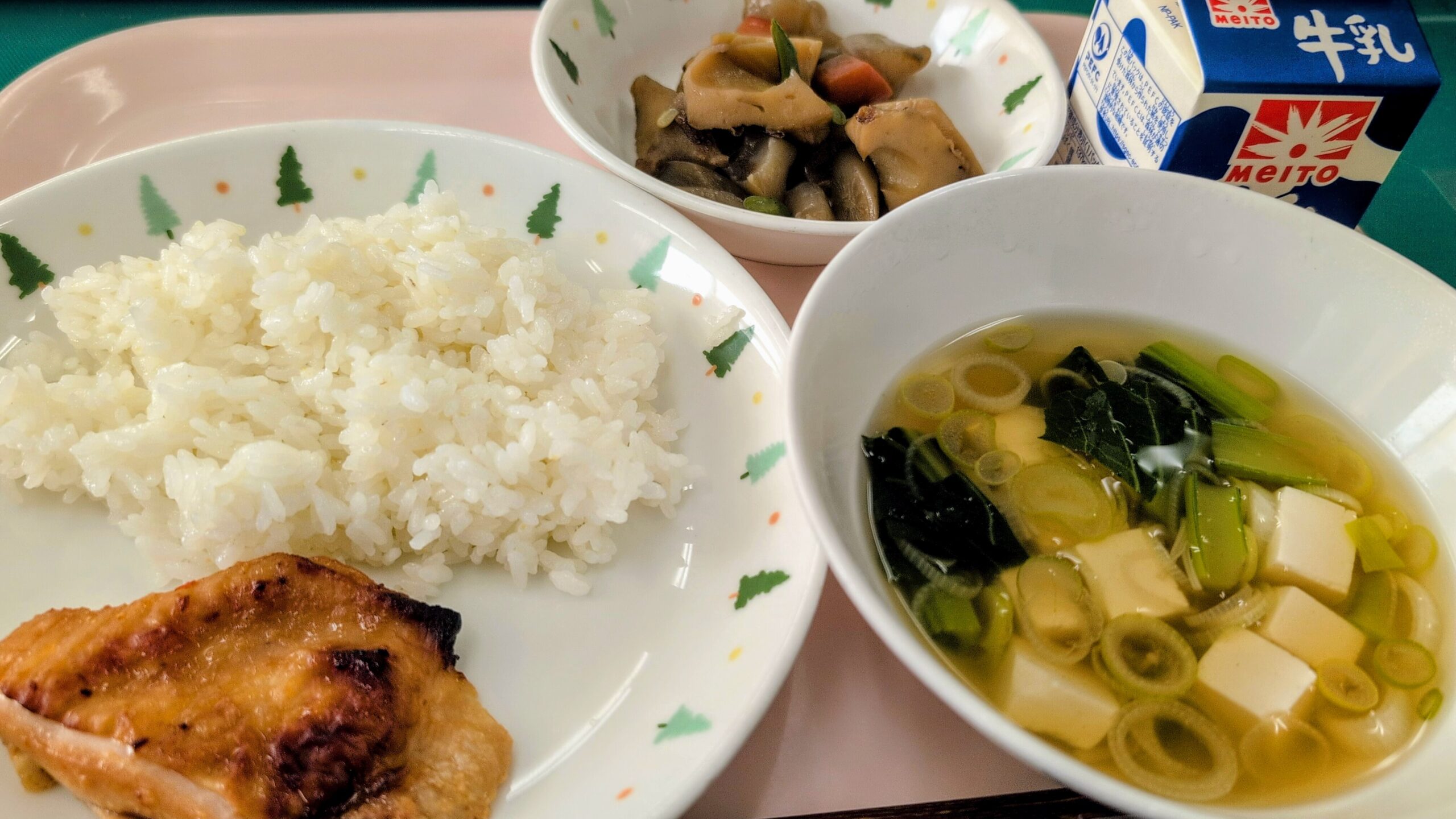 学校全体ごはん、鶏肉の変わり味噌焼き、すまし汁、五色煮、牛乳