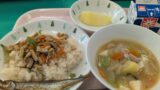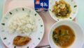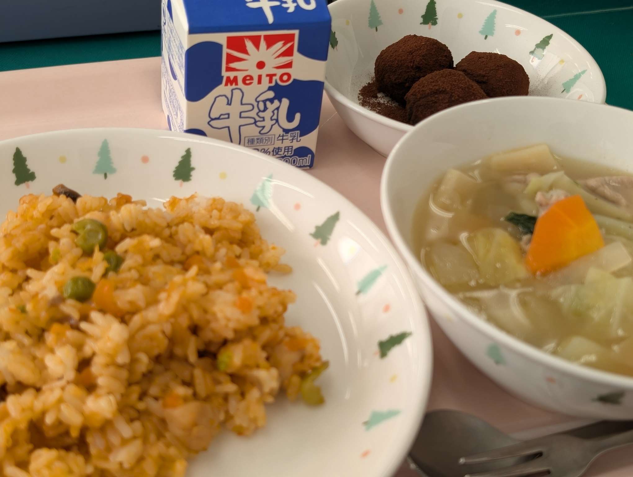 学校全体チキンライス、野菜のスープ煮、ショコラ餅、牛乳