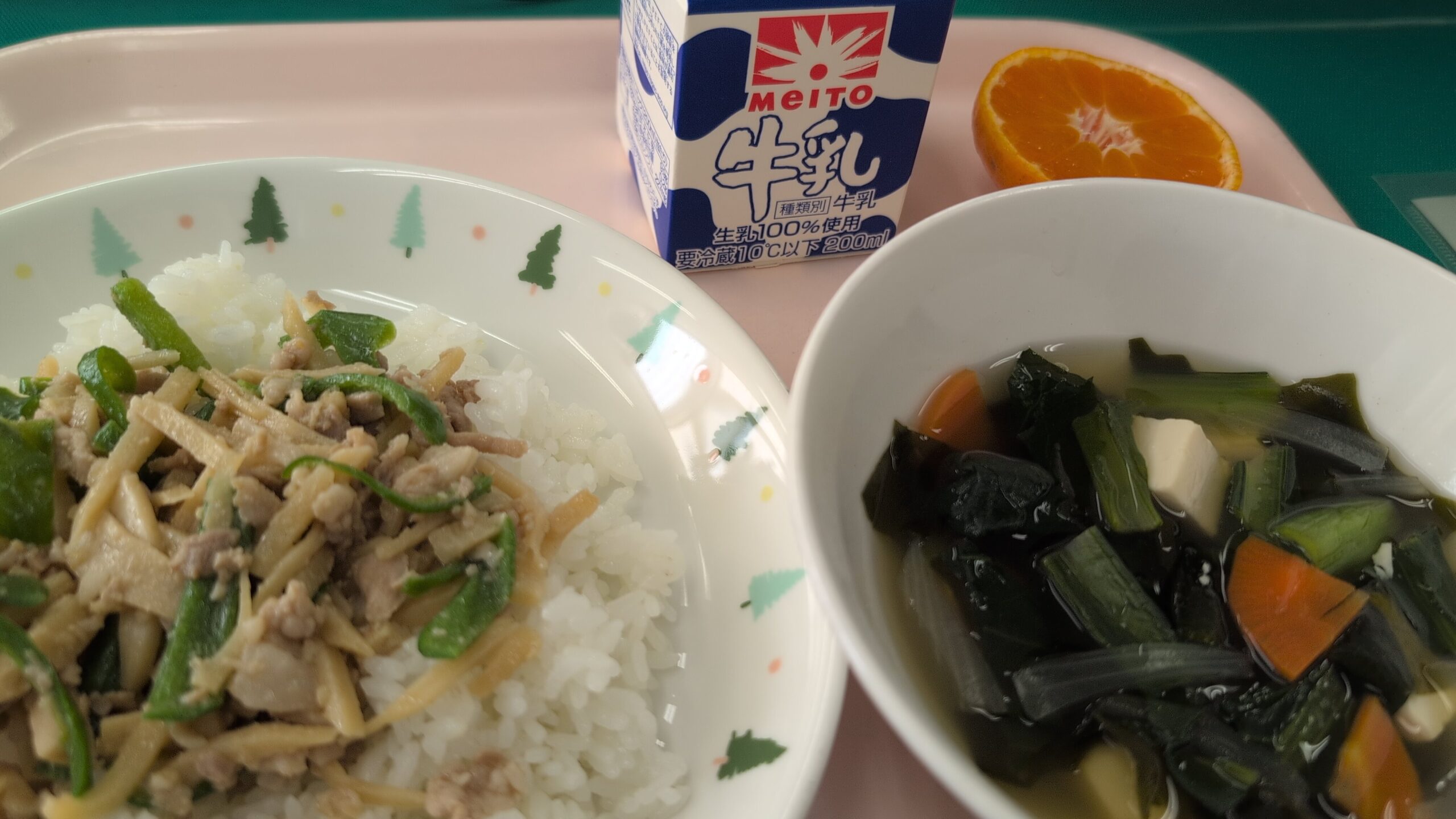 学校全体チンジャオロース、わかめスープ、菊花みかん、牛乳