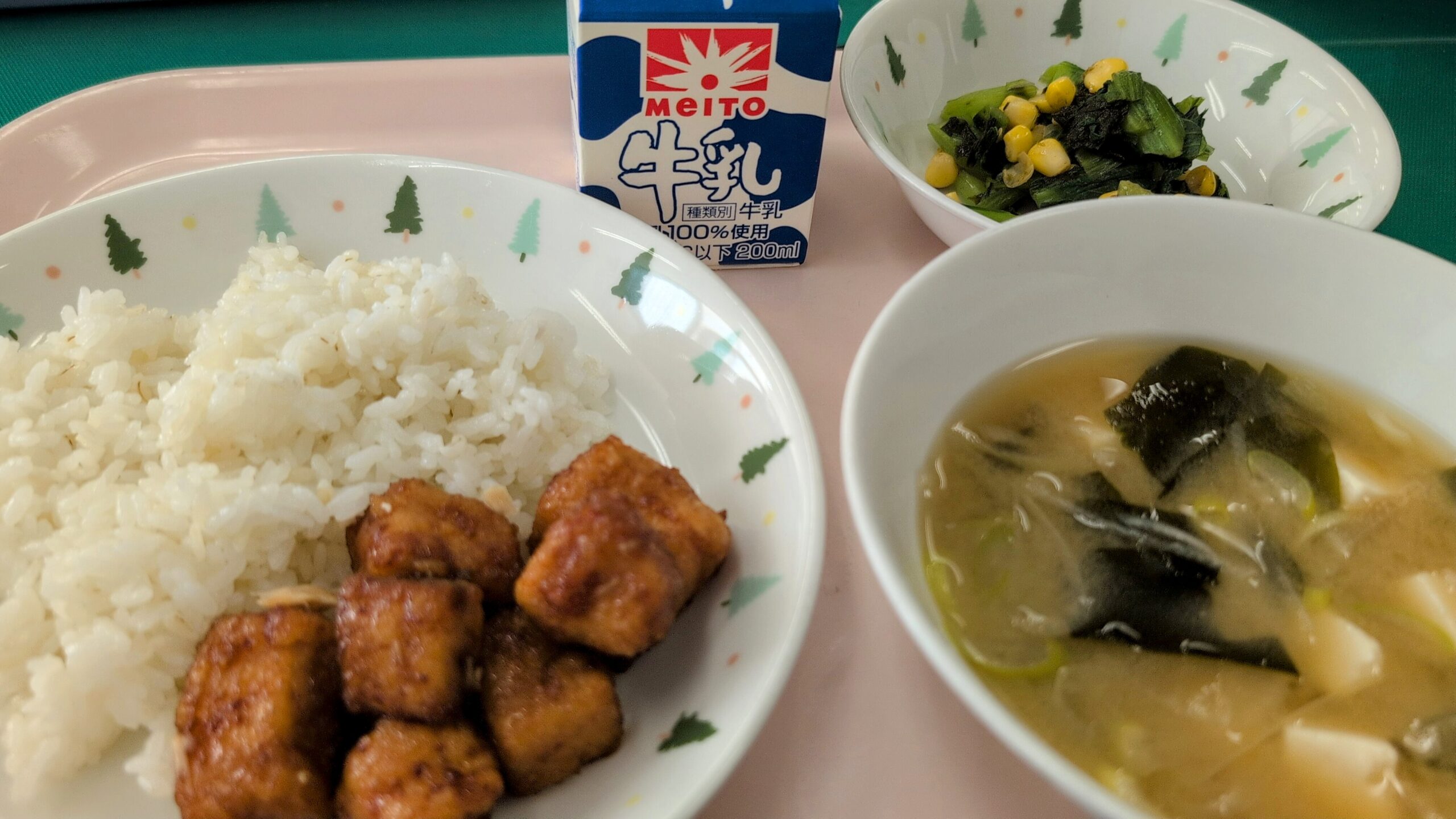 学校全体麦ごはん、牛乳、メカジキの東煮、味噌汁、小松菜の磯合え