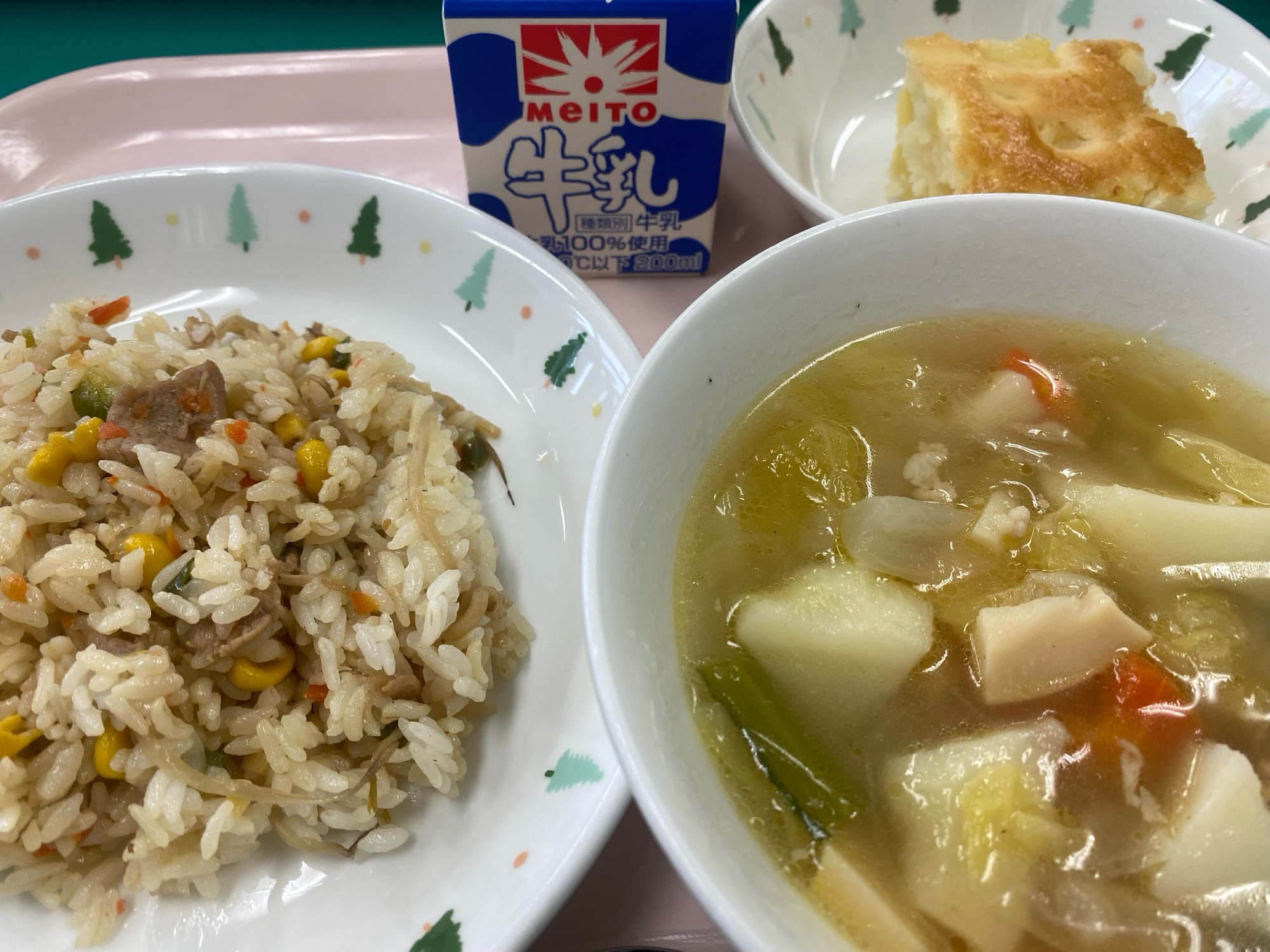 学校全体もやしチャーハン、野菜のスープ煮、パイナップルケーキ、牛乳