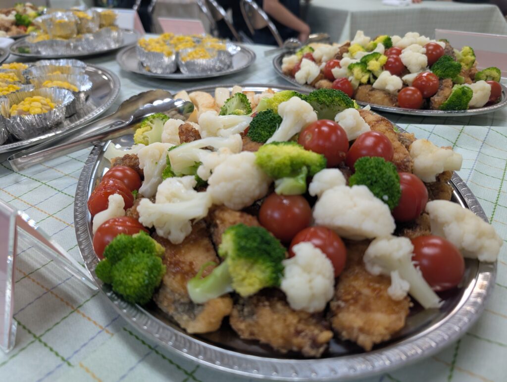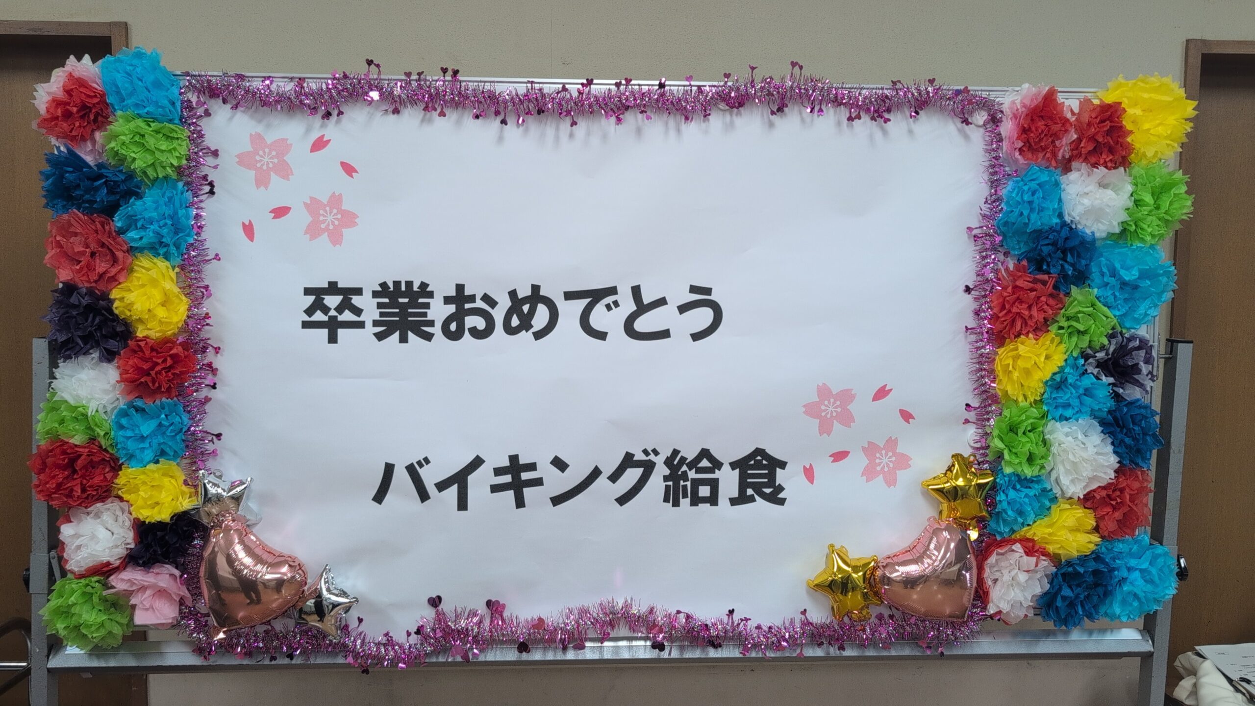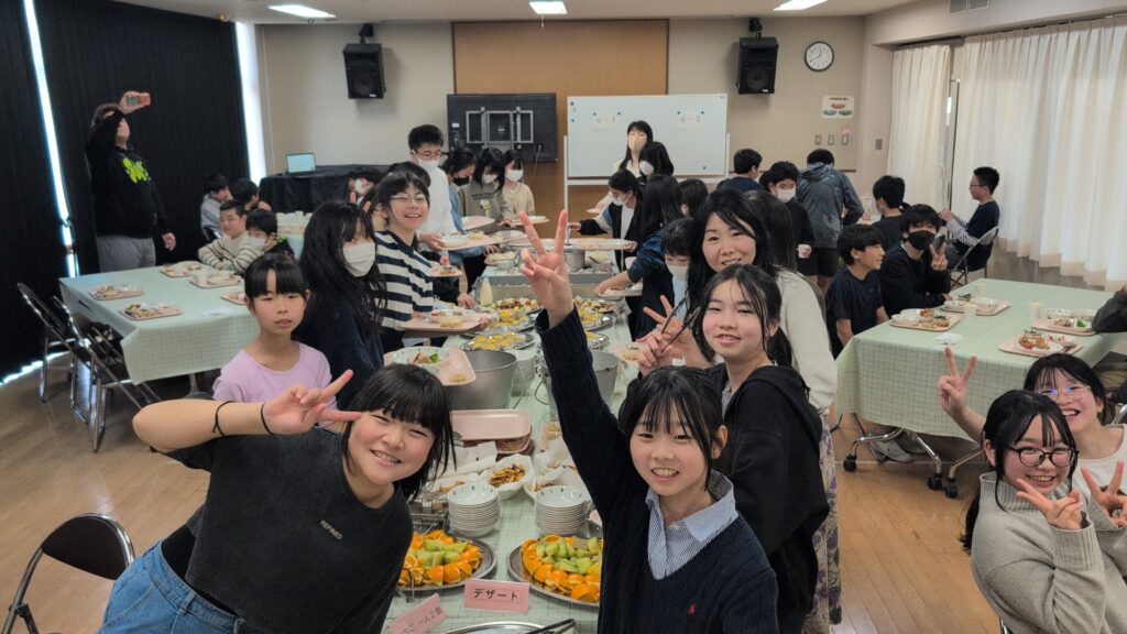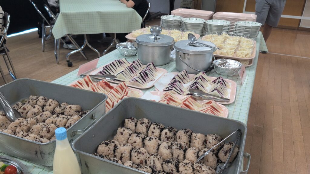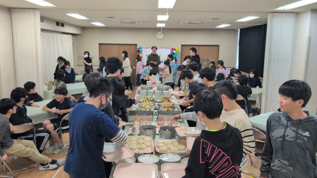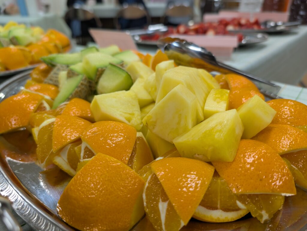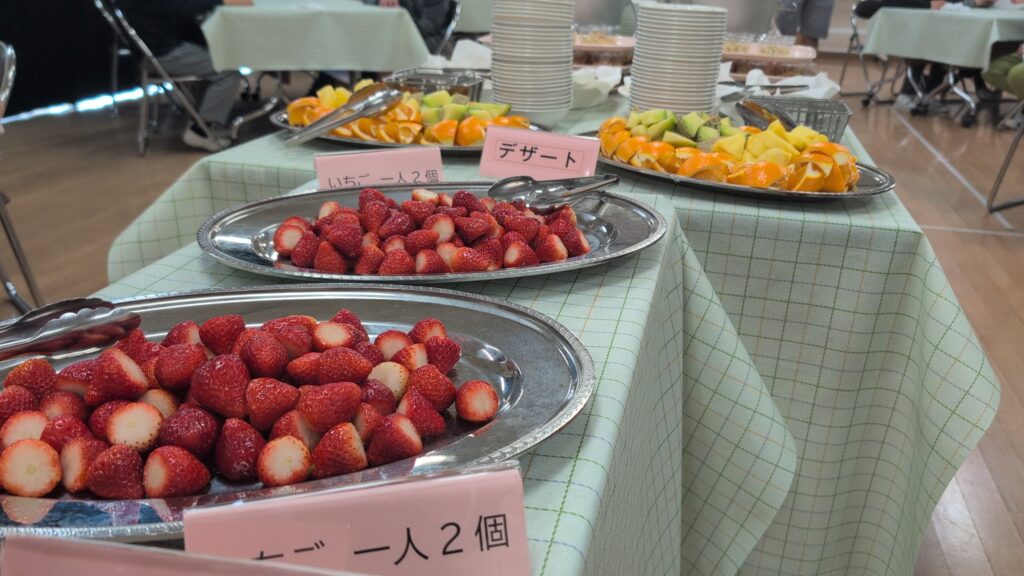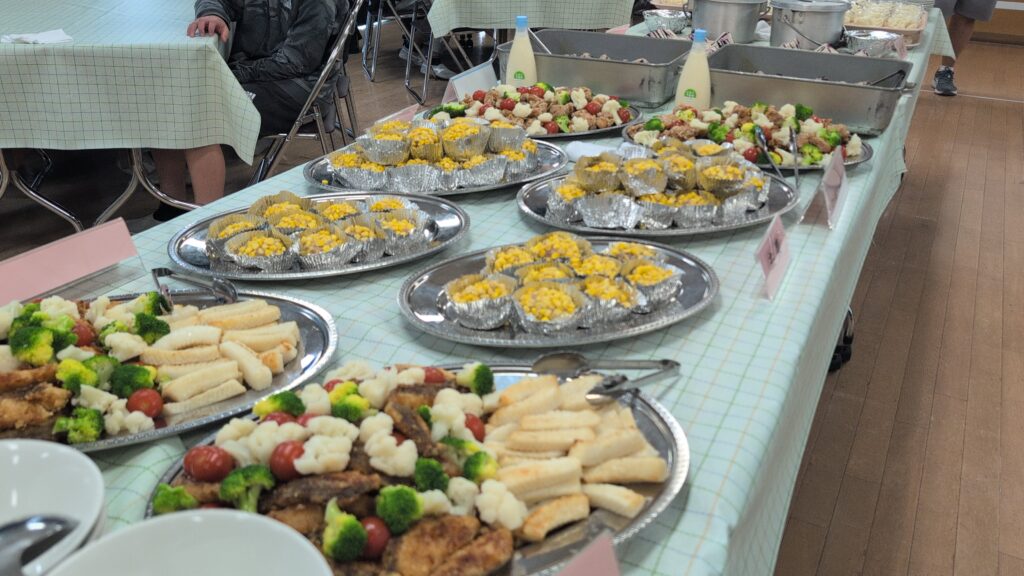 通常の給食準備も大変な中、栄養士さんや調理員さんが特別にバイキングスタイルの給食を用意してくださいました。まつのきルームは、まるでホテルのレストランのような雰囲気。ずらりと並んだ豪華なメニューに、子供たちのテンションも最高潮です。