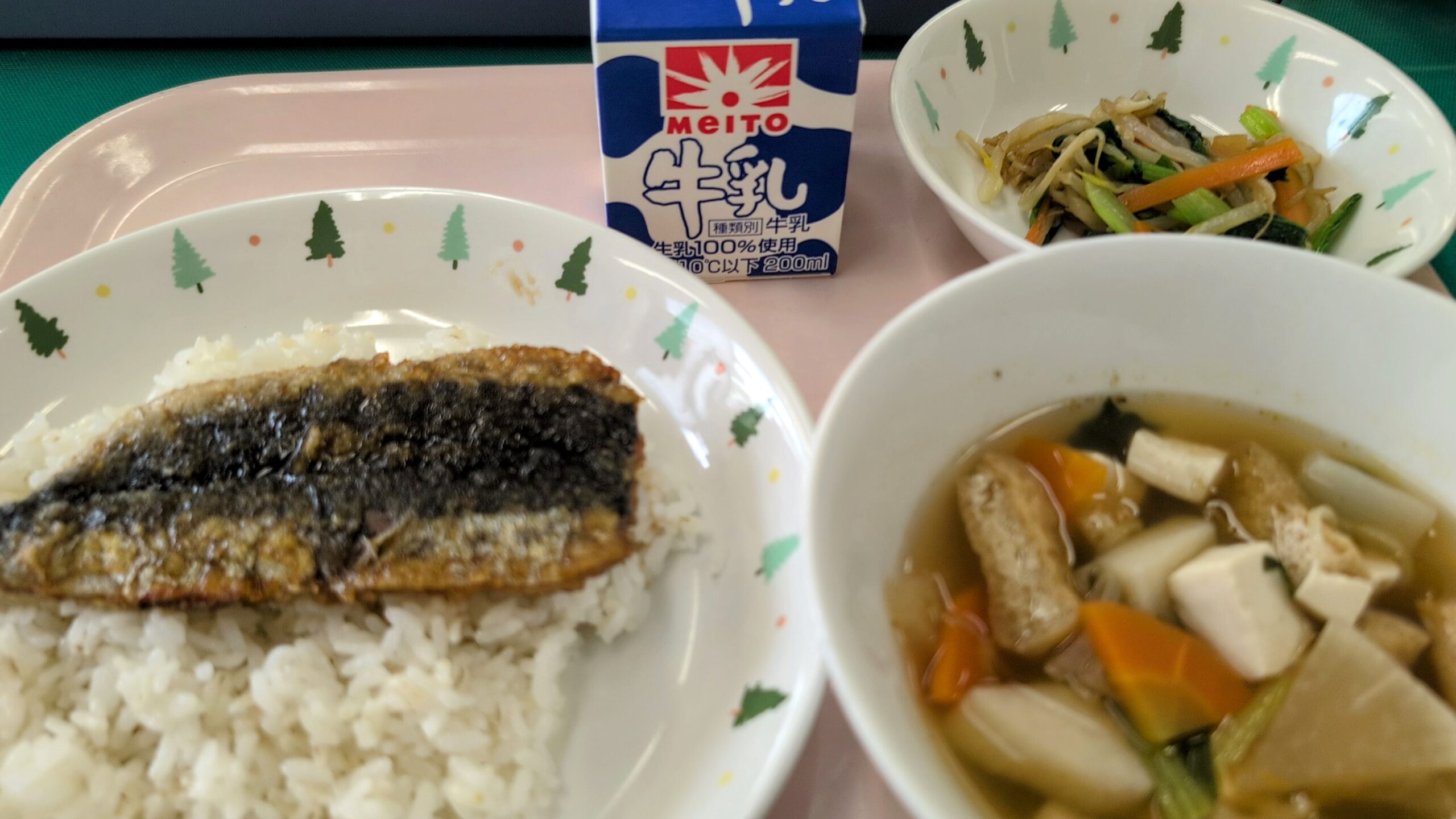 鰯の蒲焼き丼、のっぺい汁、三食和え、牛乳
