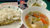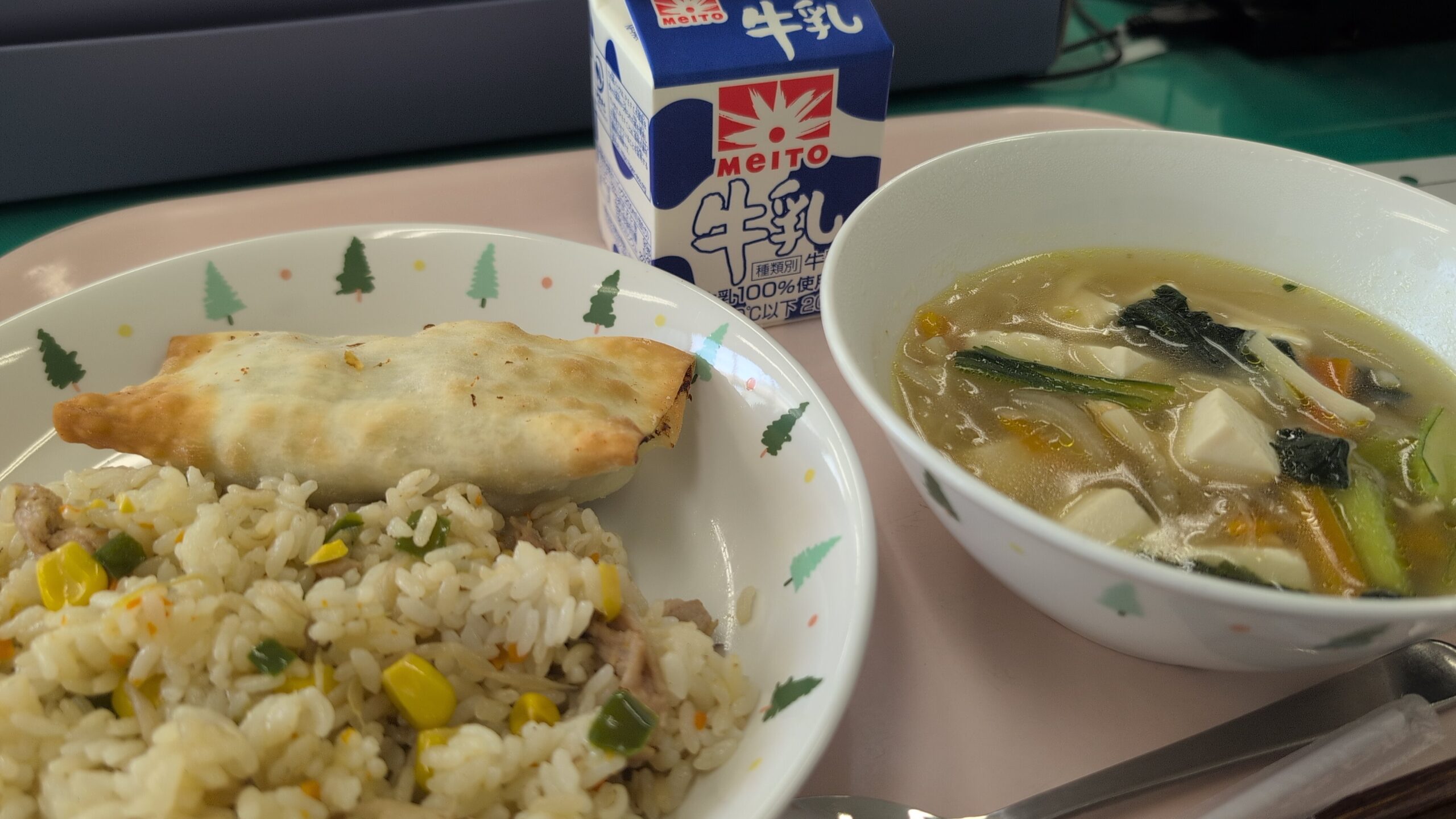 学校全体もやしチャーハン、棒餃子、中華スープ、牛乳