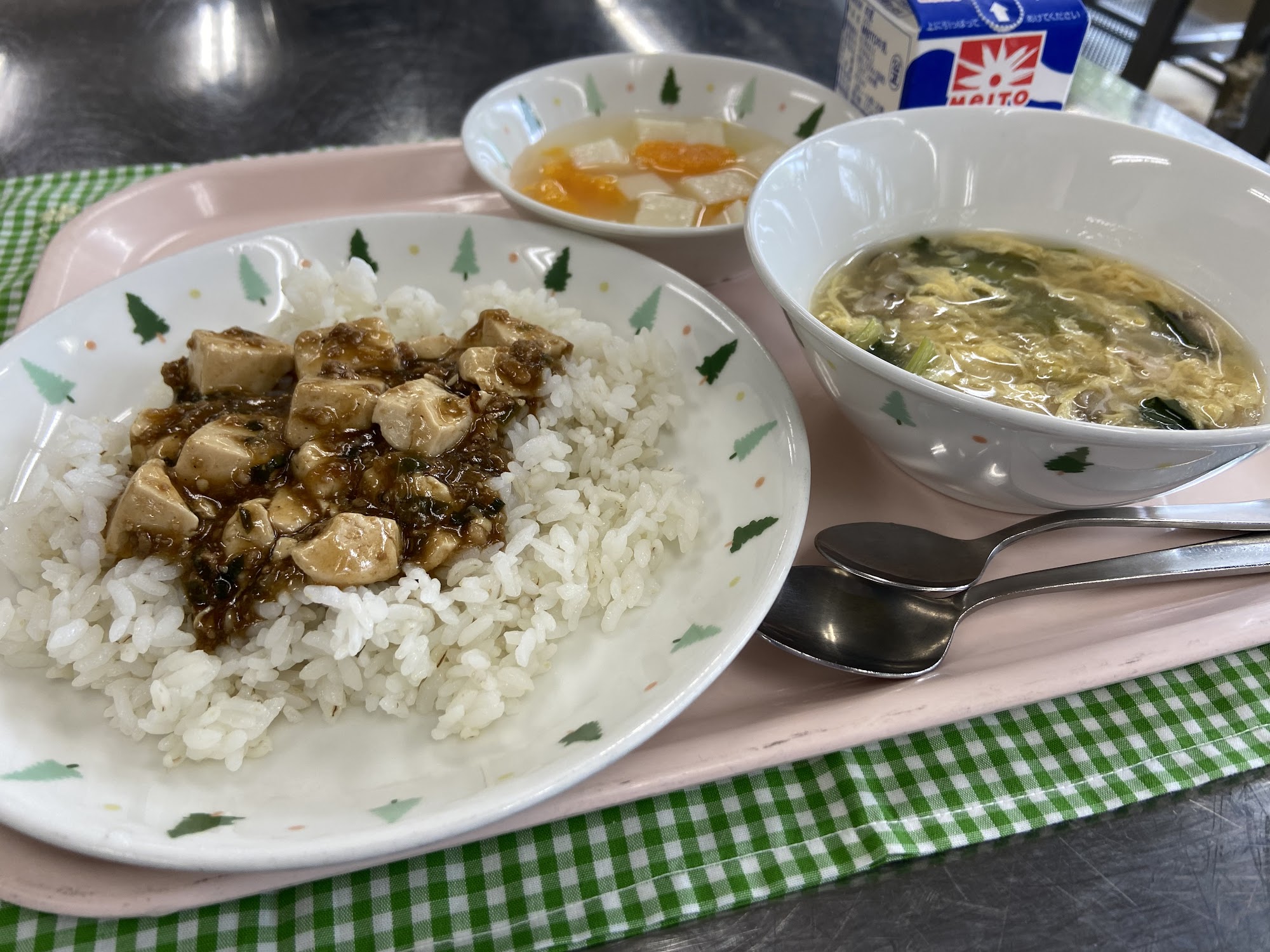 四川豆腐ライス、チンゲン菜としめじのスープ、にゅうないどうふ、牛乳