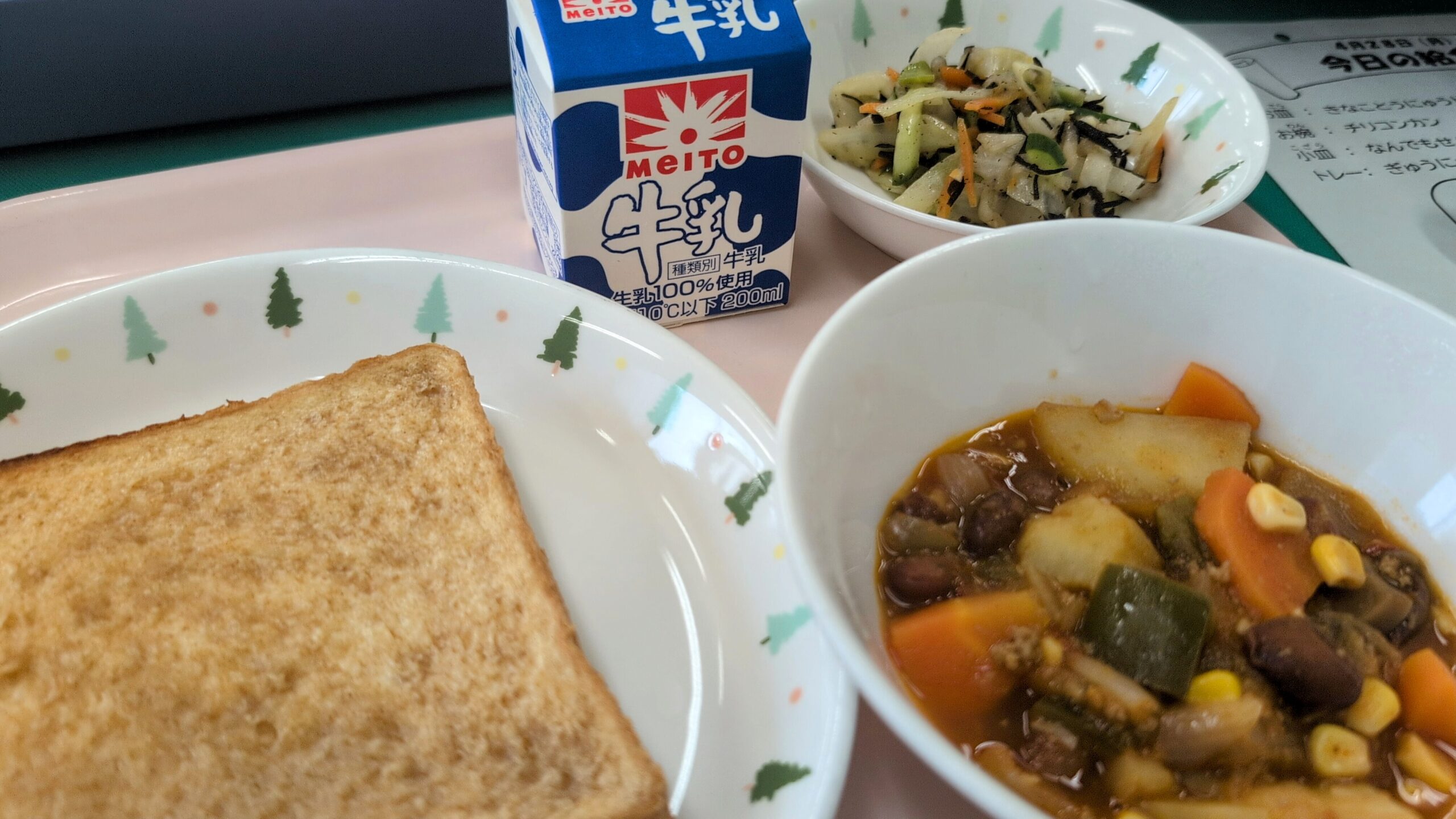 学校全体きな粉豆乳トースト、チリコンカン、なんでも千切りサラダ、牛乳