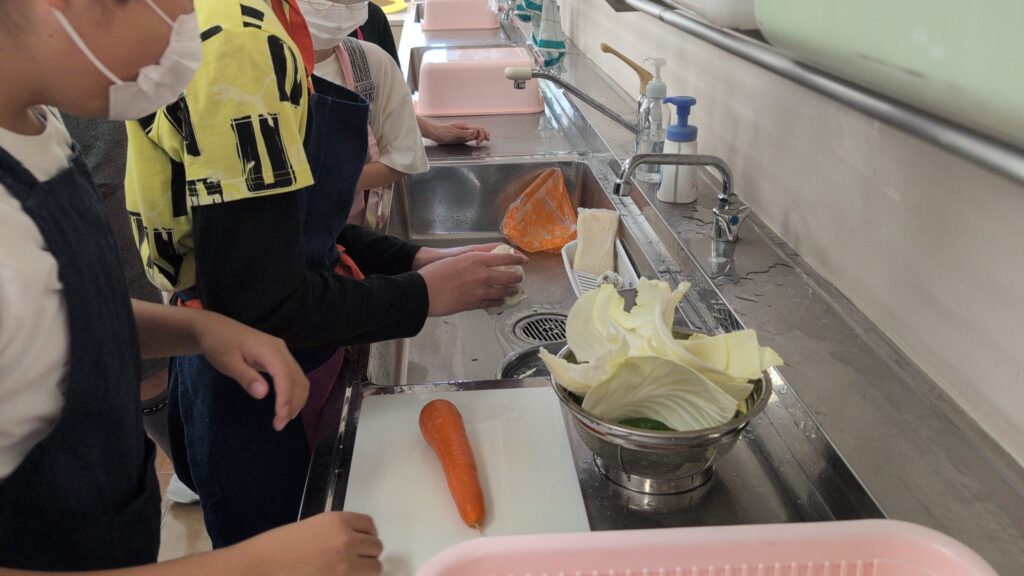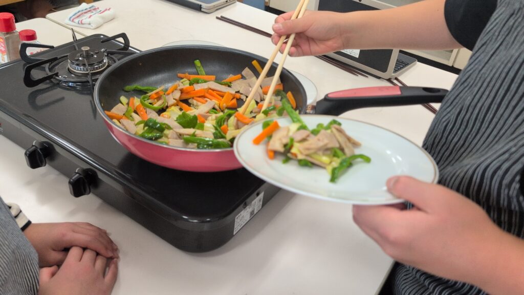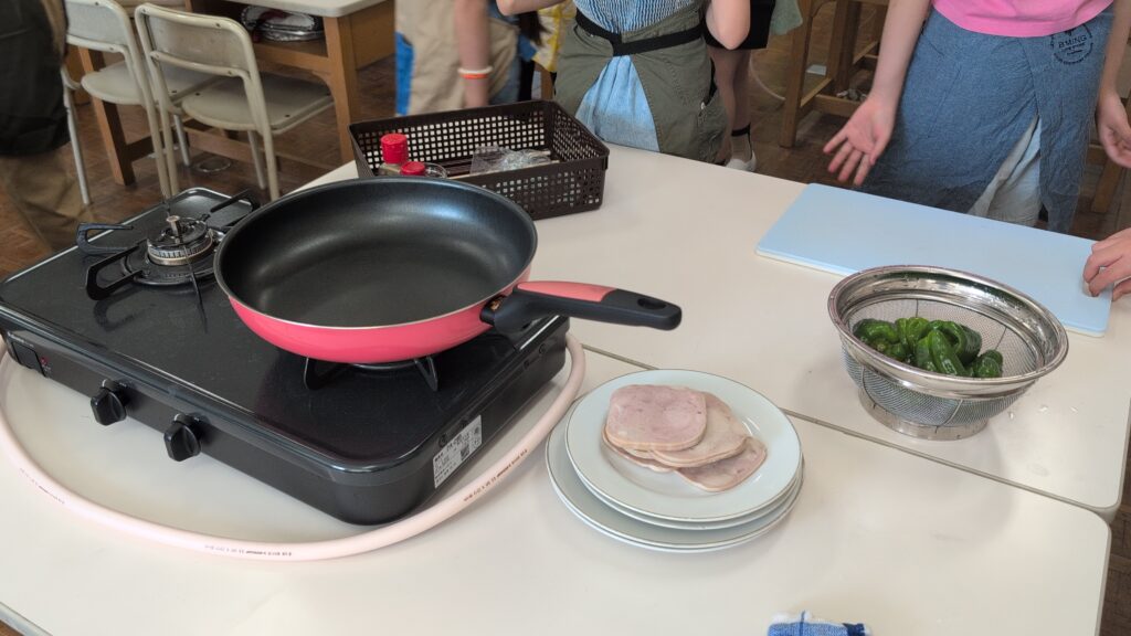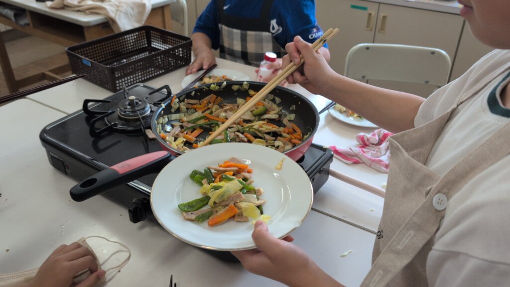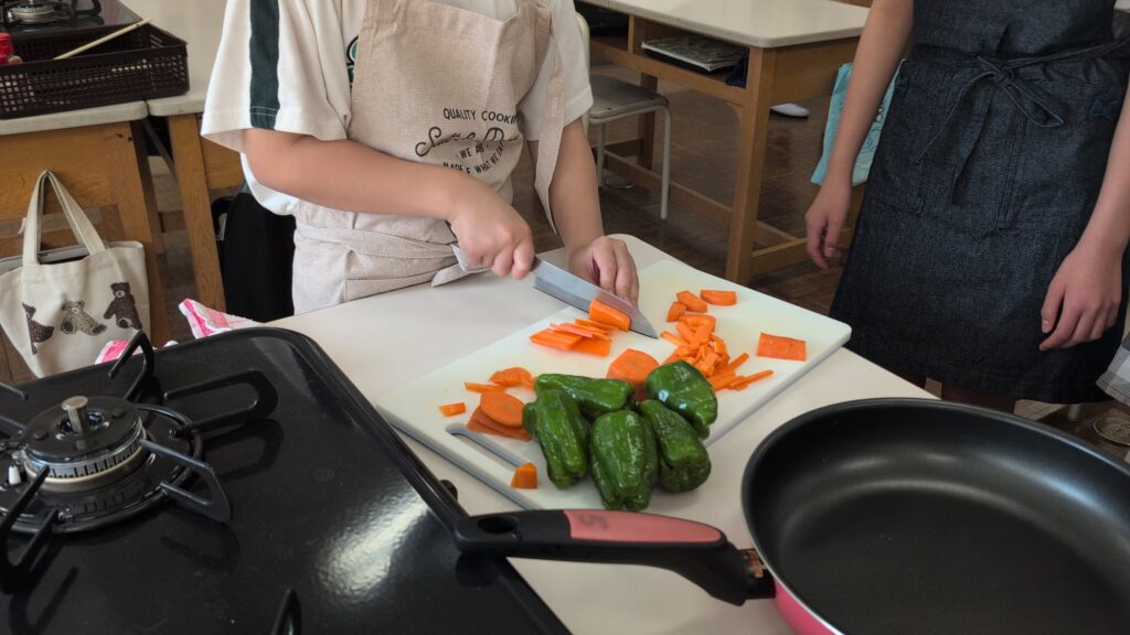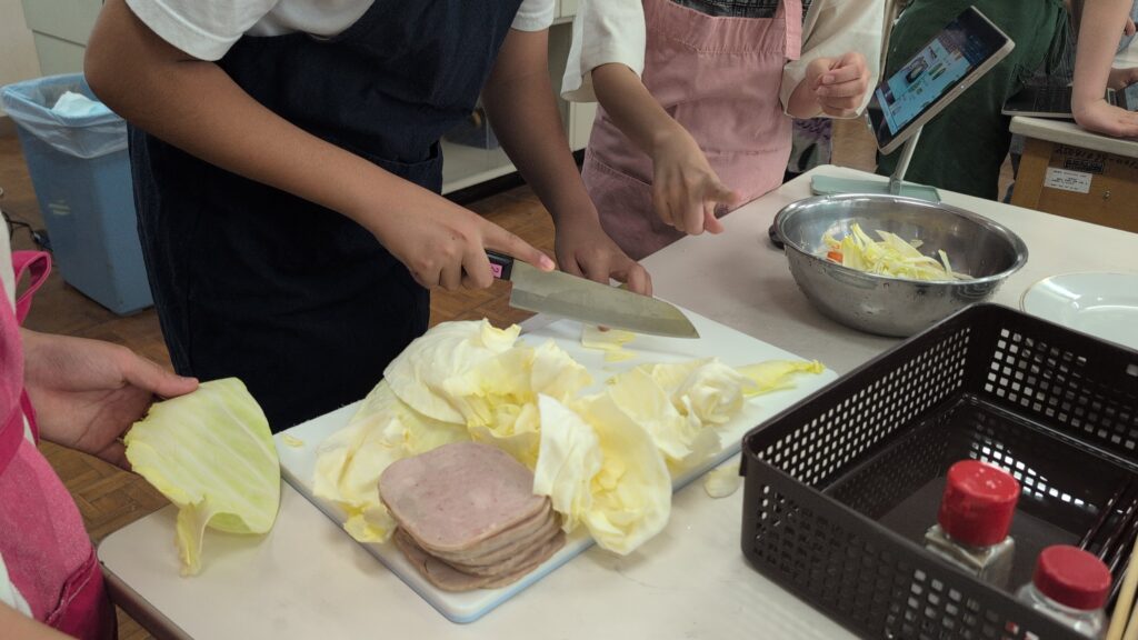 今日は6年生が家庭科の調理実習で野菜炒めを作っていました。