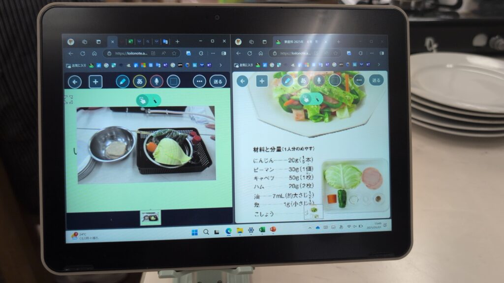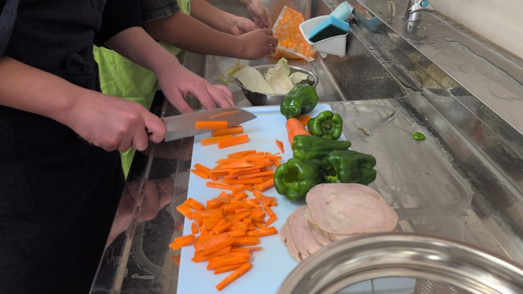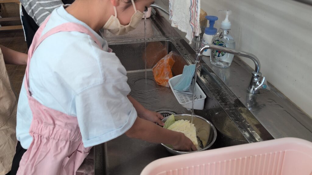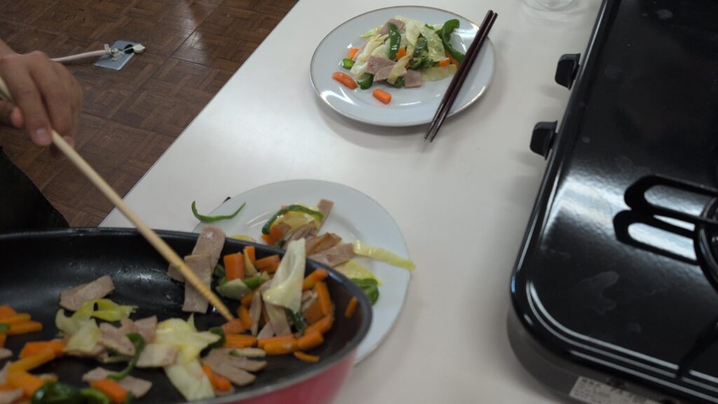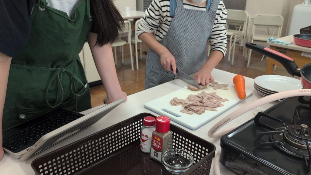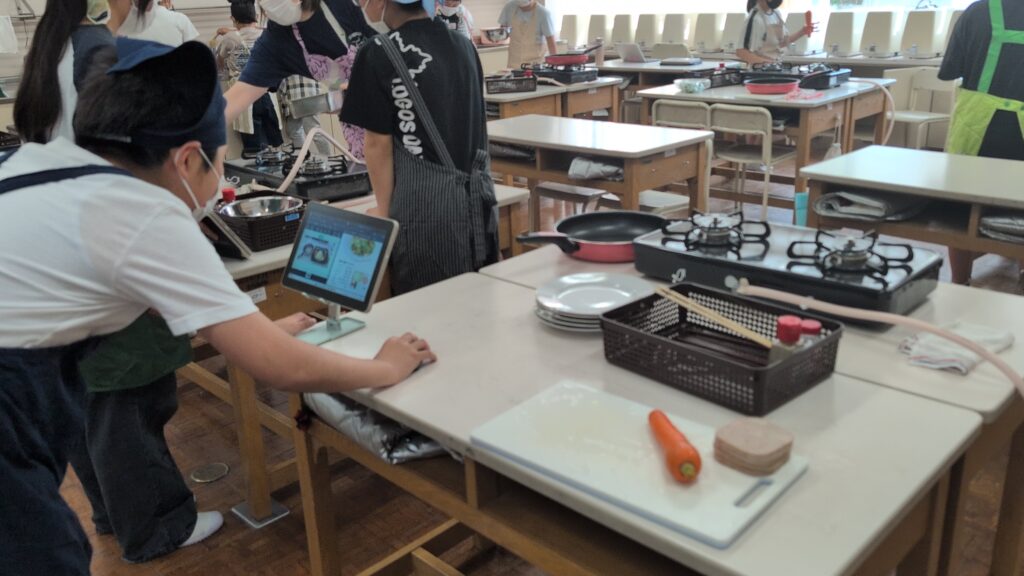 今日は6年生が家庭科の調理実習で野菜炒めを作っていました。