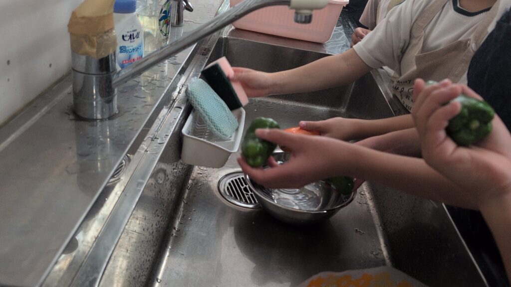 包丁を使う手元には、それぞれの経験値があらわれていましたが、どの子も真剣なまなざしで取り組んでいました。