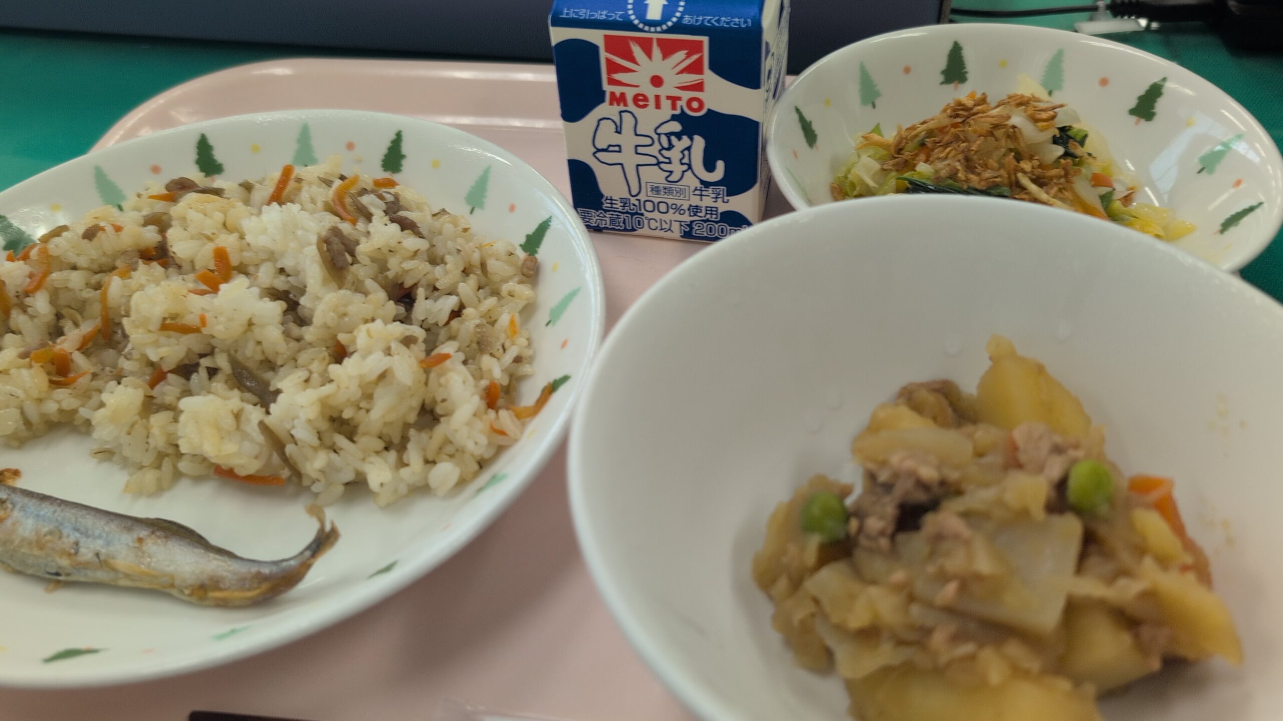 ・きんぴらごはん ・焼きししゃも ・肉じゃが ・カリカリごぼうのサラダ ・牛乳