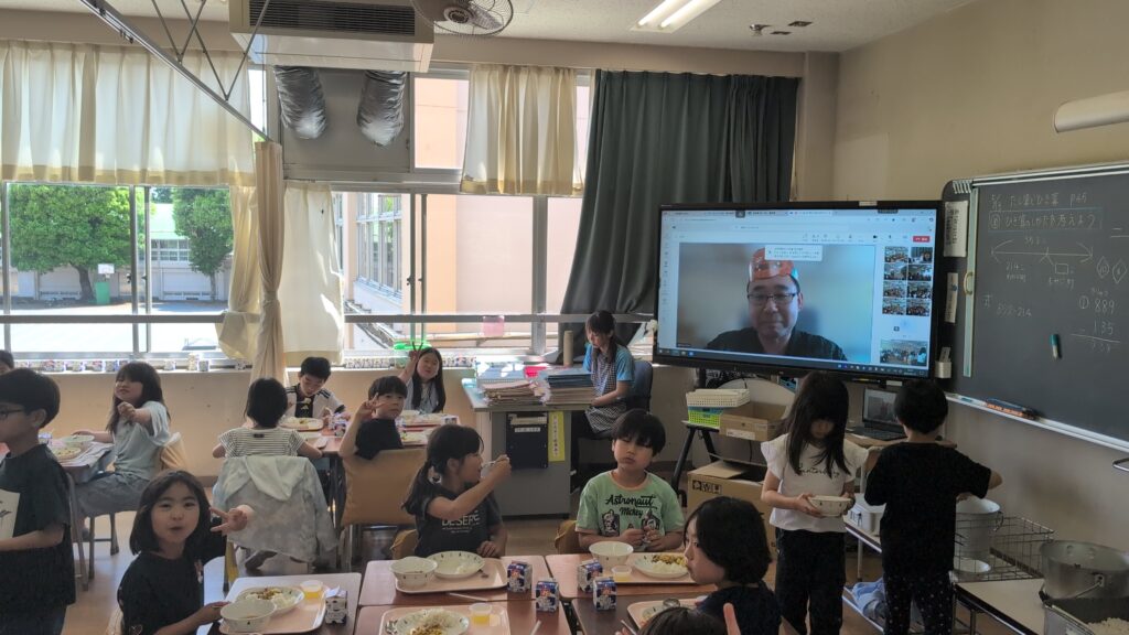 給食時間に、副店長さんと本部広報部の方が学校を訪問され、給食の時間に子どもたちへ献立の紹介もしてくださいました。