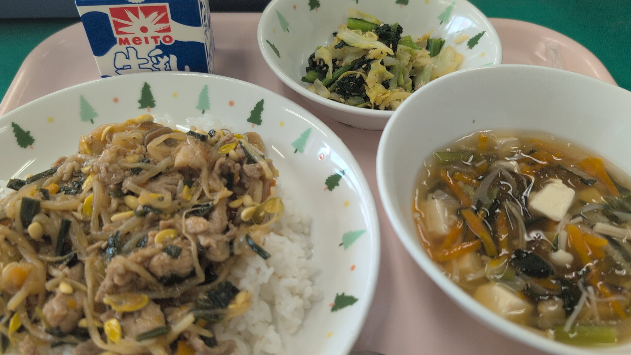 学校全体今日の給食は、プルコギ丼、春雨スープ、野菜のナムル、牛乳でした。