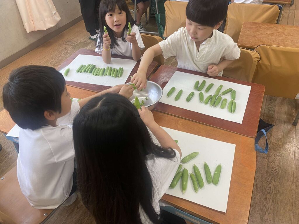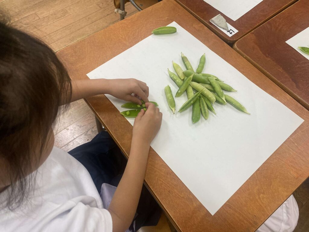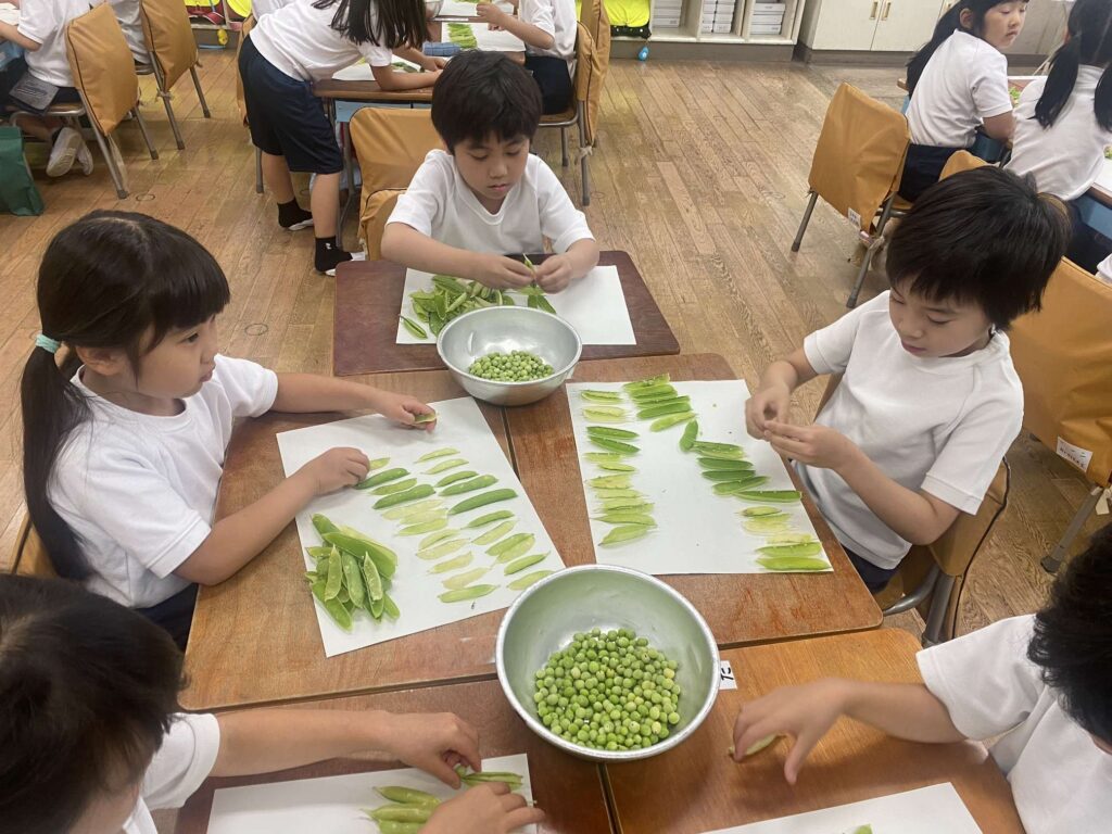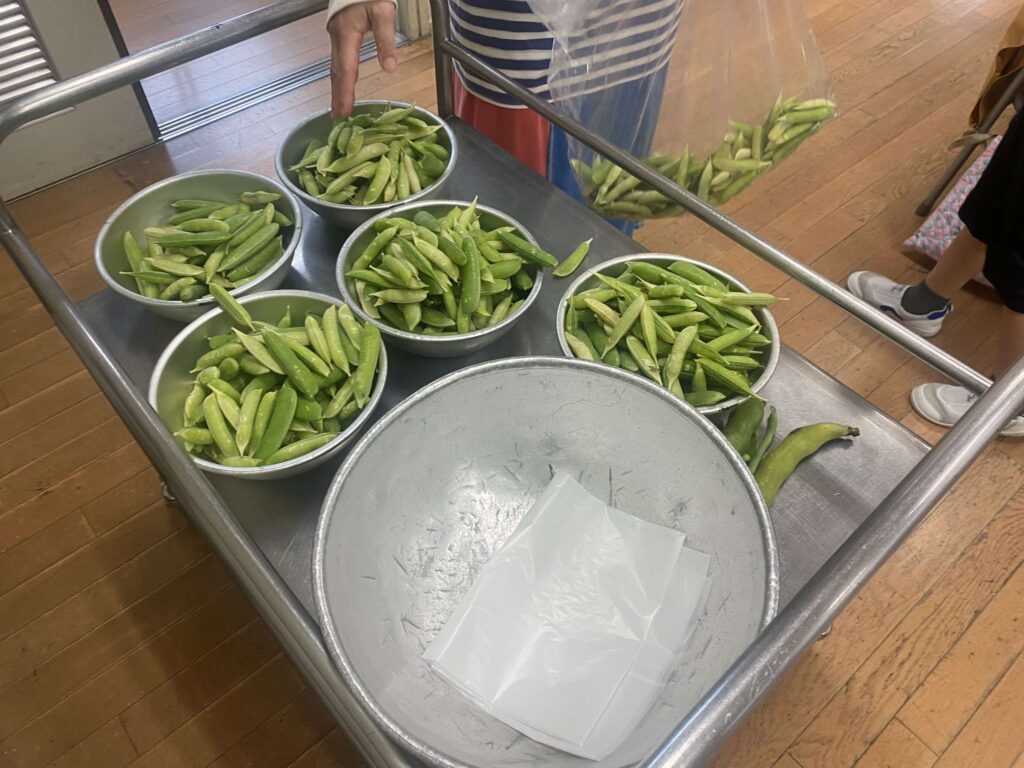 今日のピースごはんには、1年生がさやむきをしてくれた新鮮なグリーンピースが使われています。