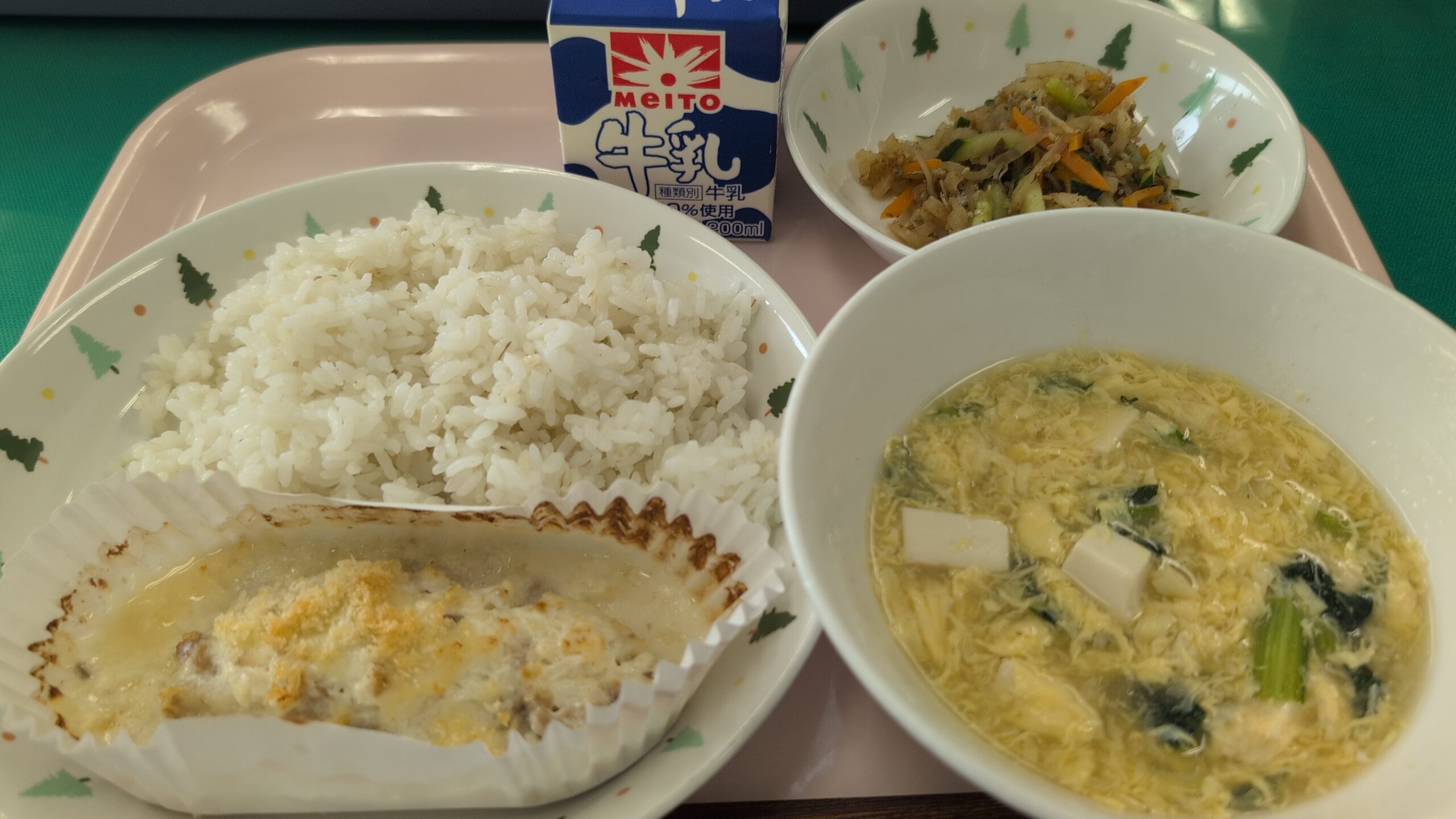 本日の給食は、麦ごはん、タラのパン粉焼き、かきたま汁、大根サラダ、牛乳でした。