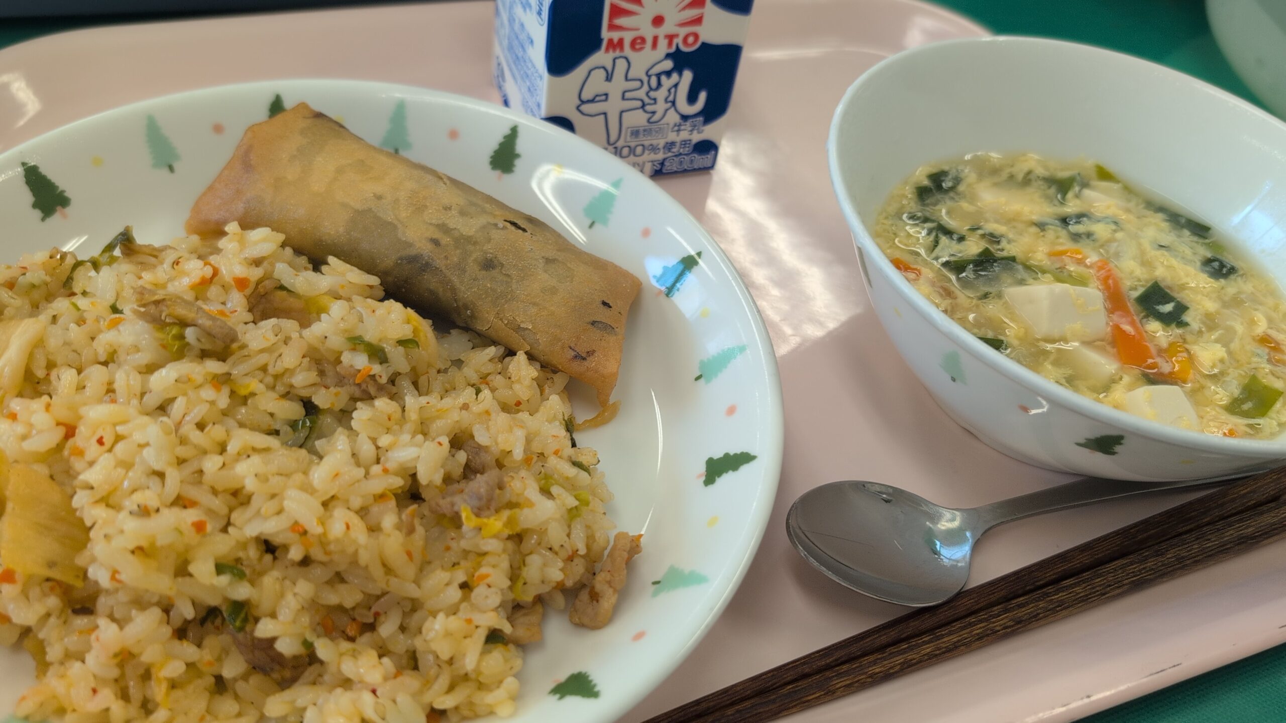 今日は、韓国風のキムチチャーハンに、春巻きの皮で包んだ「パリパリひじき」が添えられたメニューでした。