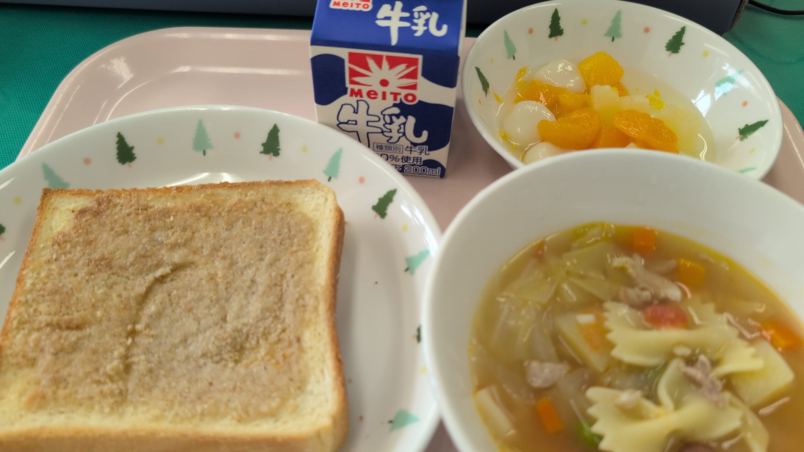 本日の給食は、セサミトースト、ミネストローネ、白玉フルーツポンチ、牛乳でした。