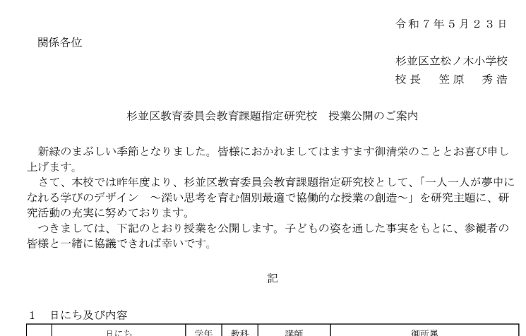授業公開のご案内 学校全体 コピー 2025.06.05 今年度の本校の授業公開についてお知らせします。 来校してくださる方はご登録をお願いいたします。 杉並区教育委員会教育課題指定研究校 授業公開のご案内ダウンロード