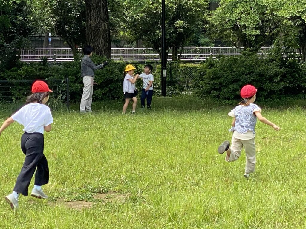 芝生の広場では、学年を超えて追いかけっこをしたり、葉っぱや木の実を見つけて遊んだりと、子供たちの笑顔があふれていました。ペア活動では、手をつないで遊ぶ姿や、優しく声をかける姿が多く見られ、微笑ましい場面がたくさんありました。