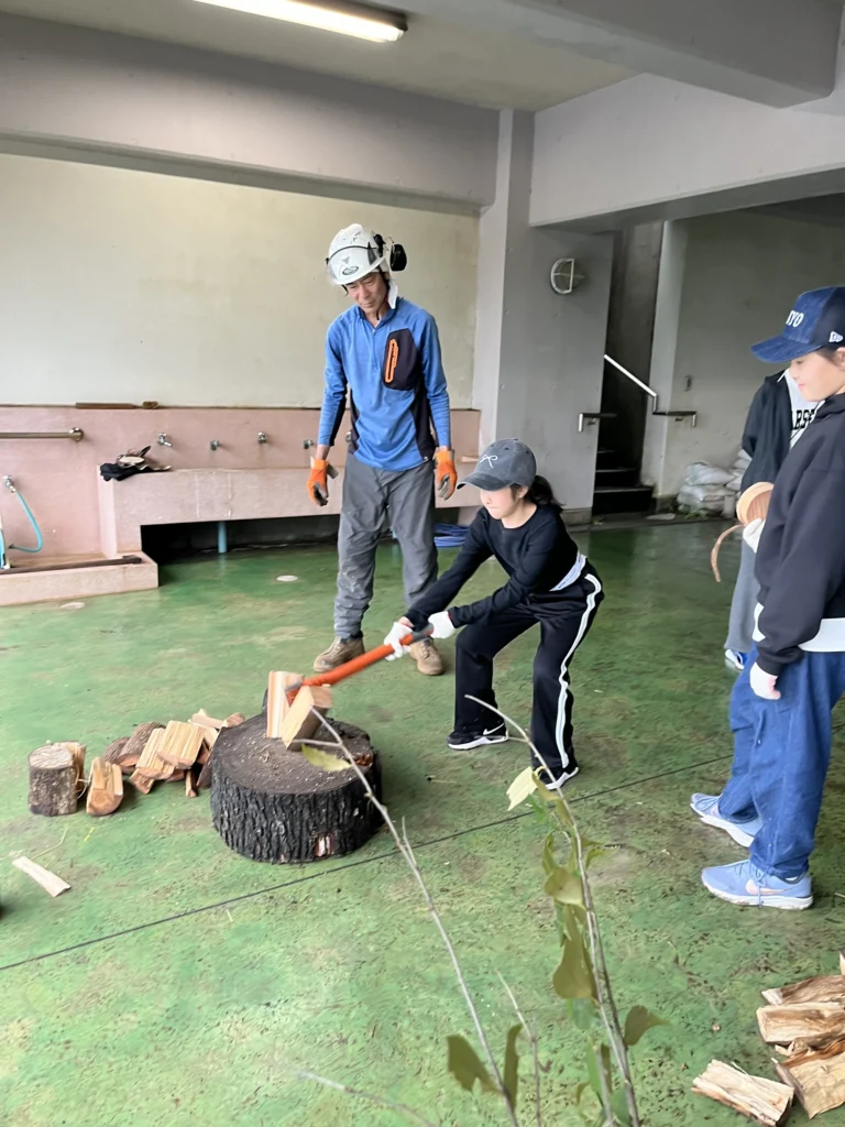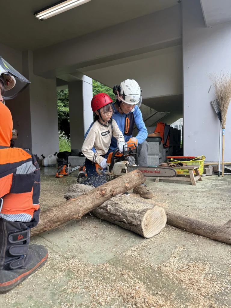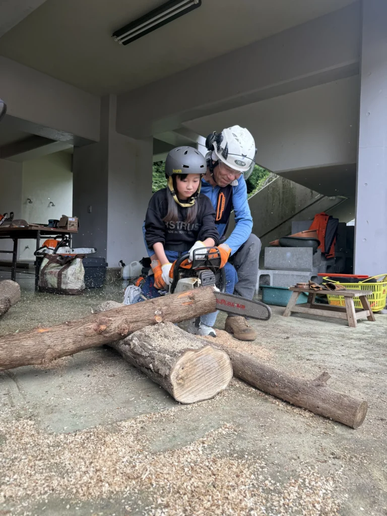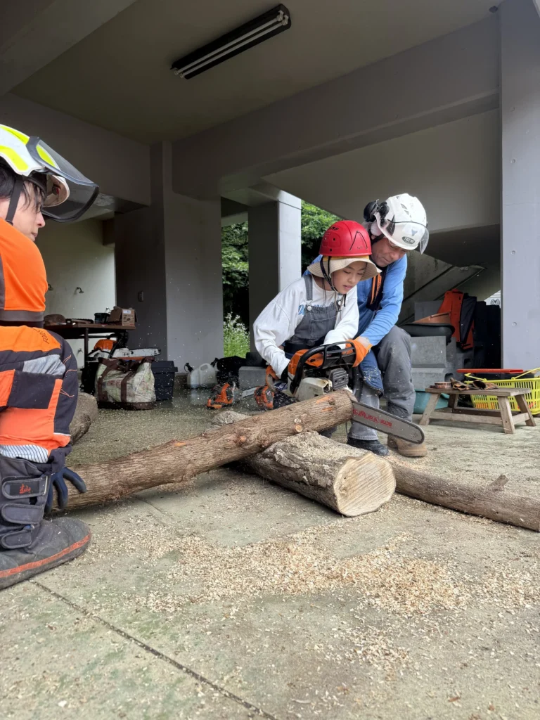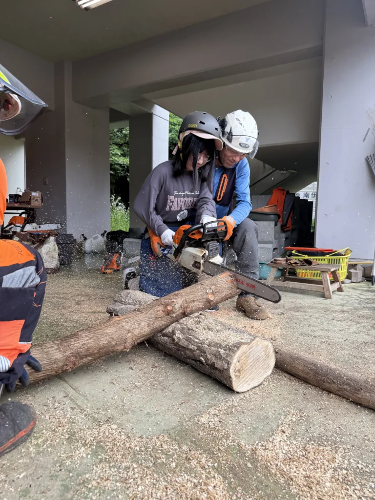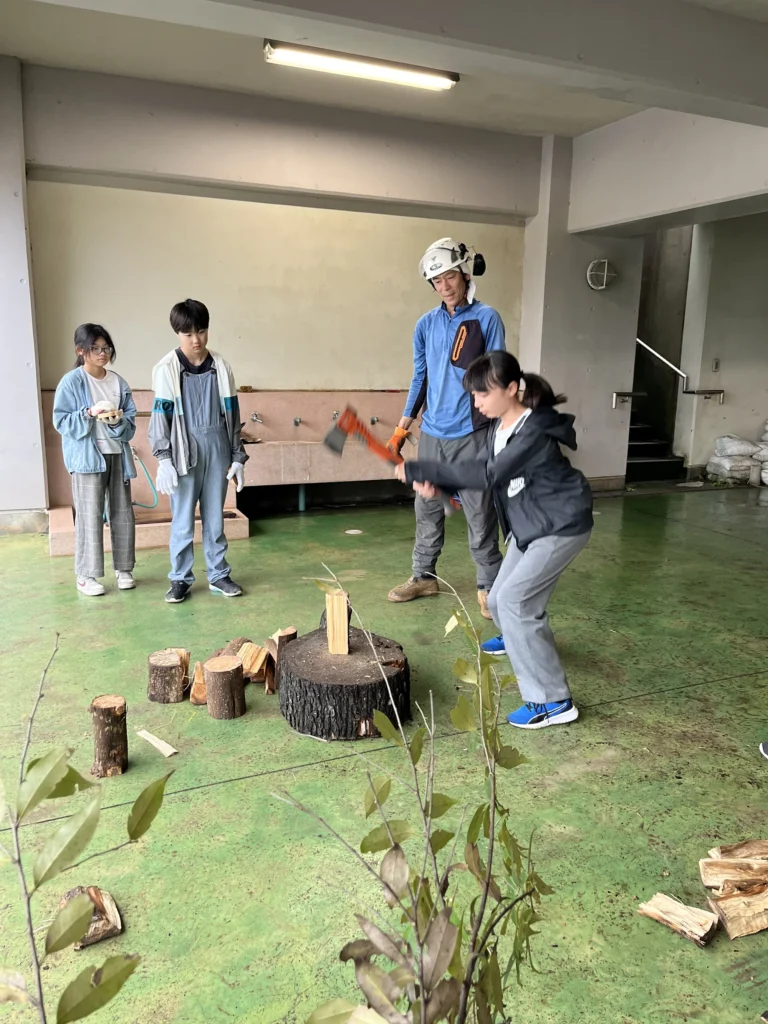 樹木医の方のお話を聞いて、実際にチェーンソー体験や薪割り体験をさせていただきました。