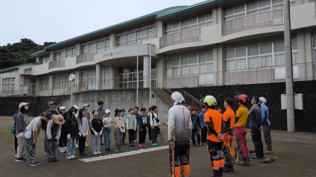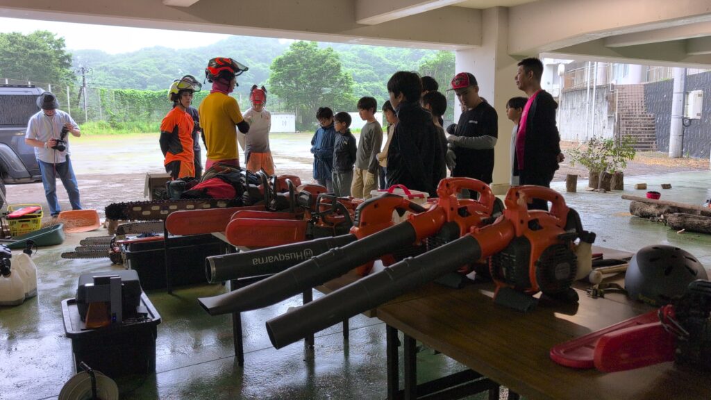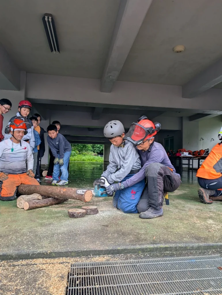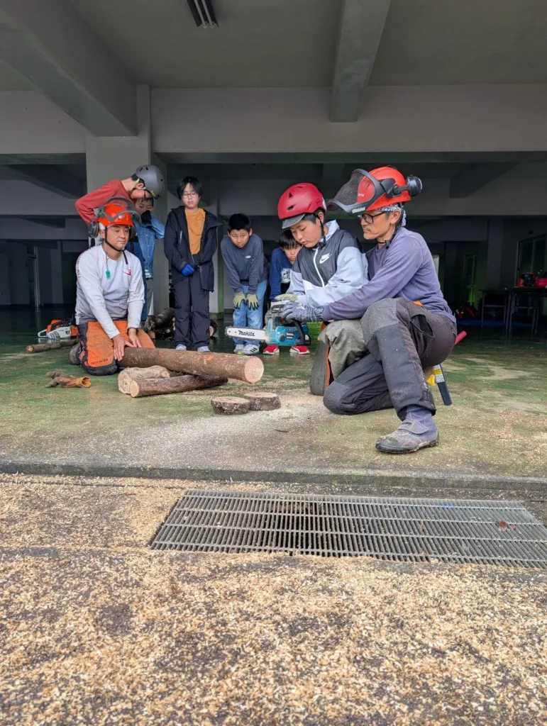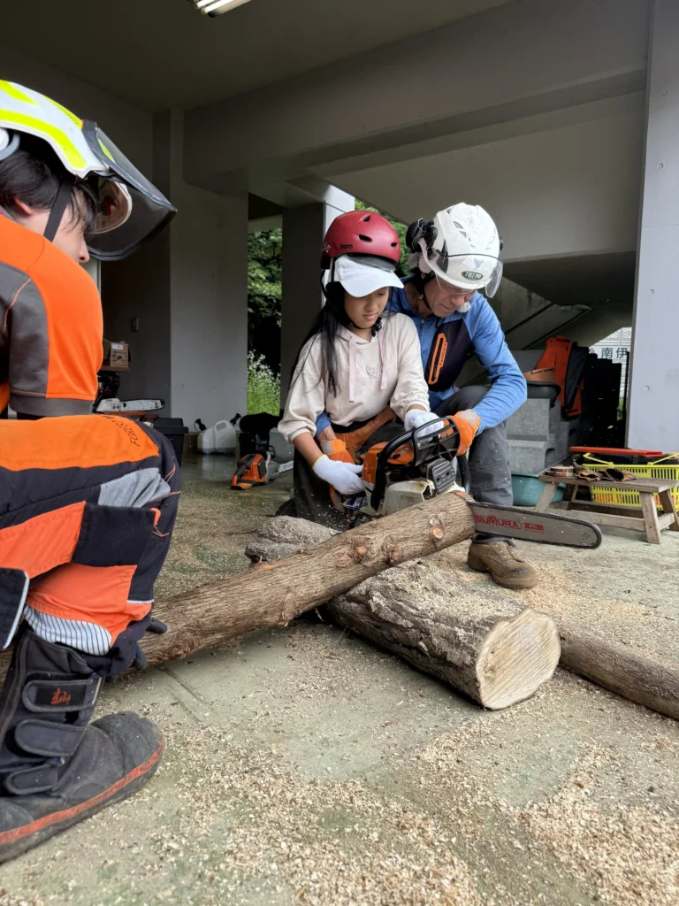 面白かったのは、チェーンソー体験。「バッテリー式」と「エンジン式」で明らかに音と迫力が違う。エンジン式チェーンソーの凄さはぜひ体験していただきたい。そんな中・・・、男子のほとんどは、バッテリー式チェーンソーを選択して体験しました。その後の女子は・・・、女子全員がエンジン式チェーンソーで豪快に木を切っていました。