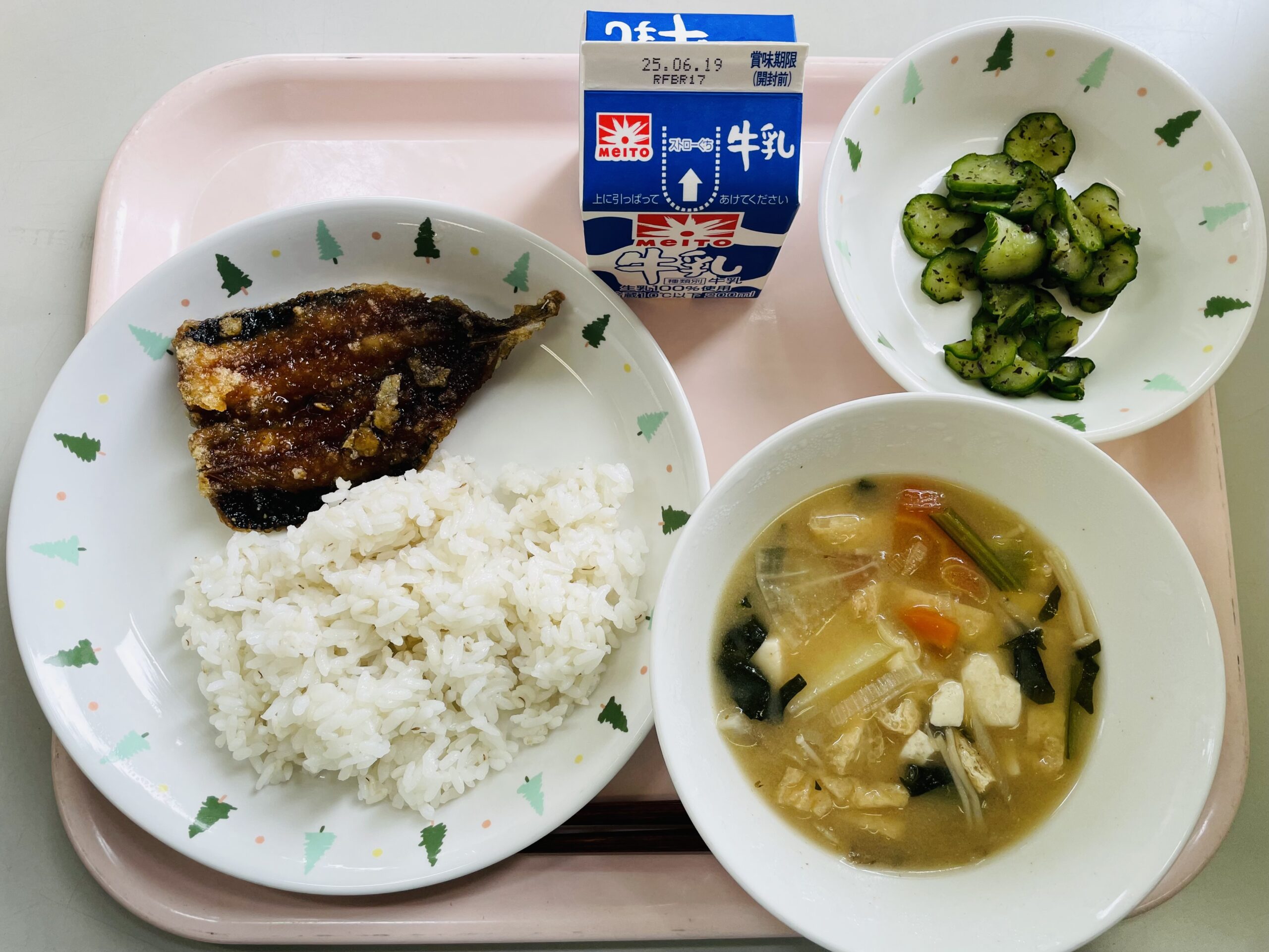 本日の給食は、麦ごはん、いわしの揚げびたし、具だくさんみそ汁、ゆかりきゅうり、牛乳でした。