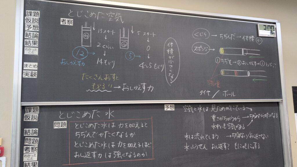 授業では、子供たちがこれまでに学習した「空気の性質」の理解をもとに、水の性質を自らの方法で調べ、考察する探究的な学びに取り組みました。