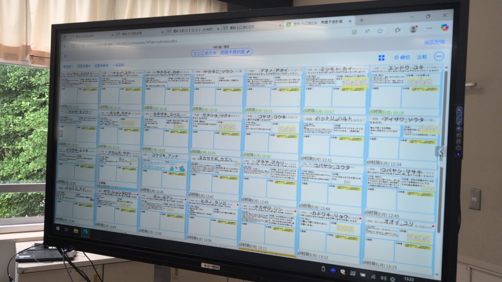 大型提示装置には、子供たち一人一人の予想や観察記録が映し出され、互いの考えに触れながら思考を深めていく姿が印象的でした。