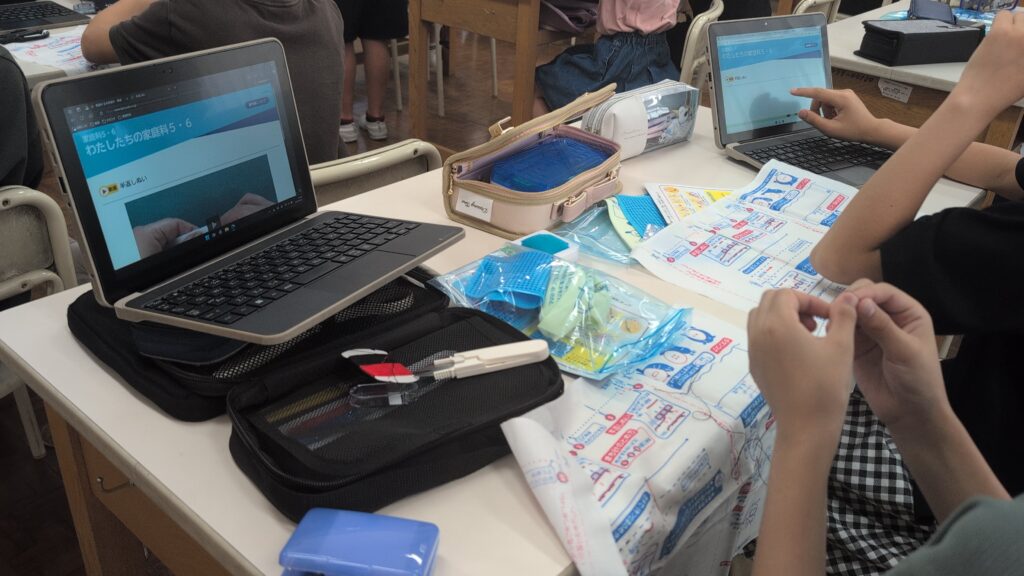 5年生は、家庭科で初めてのソーイングに取り組んでいます。