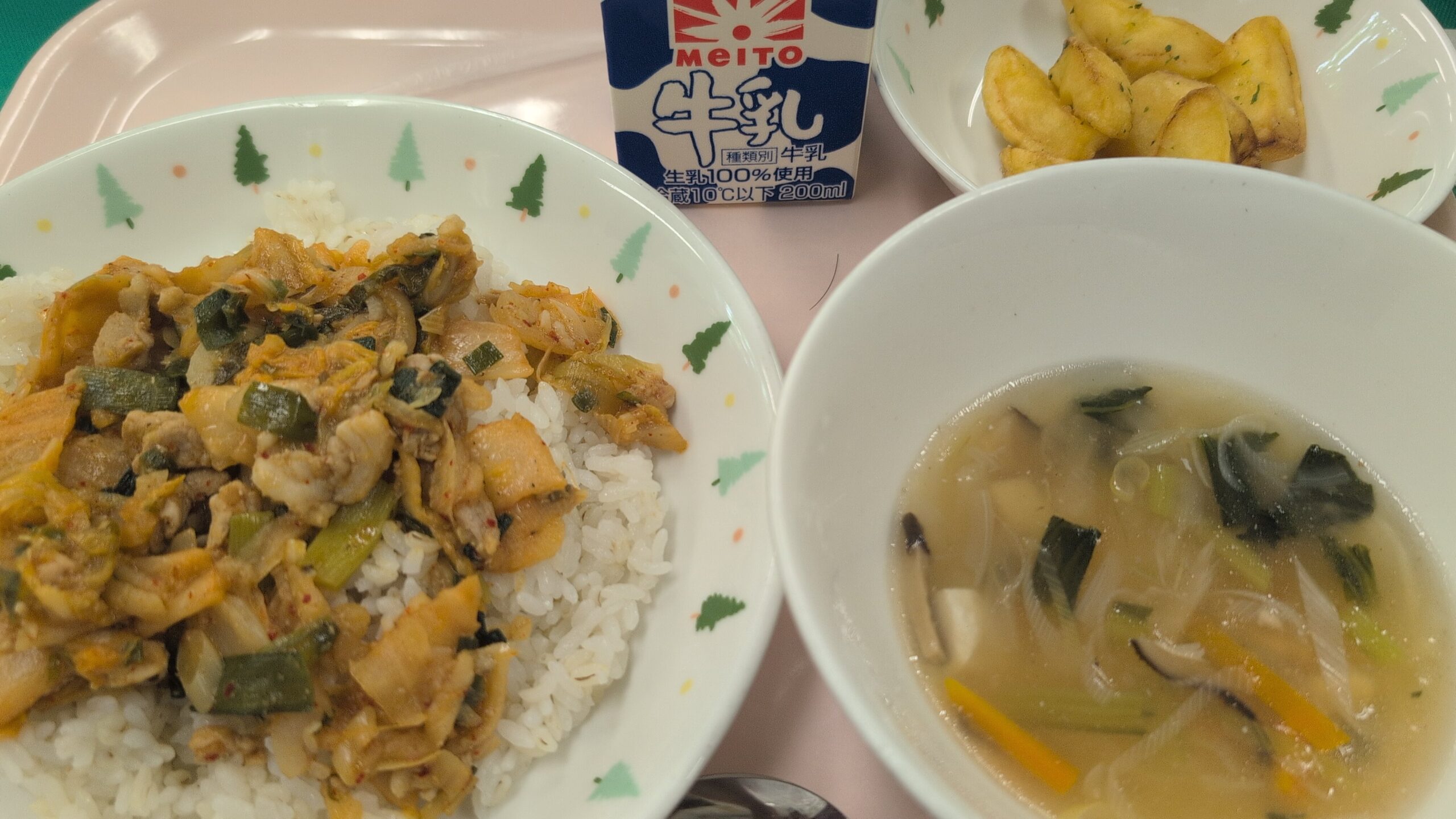 本日の給食は、キムチ丼、中華スープ、ガーリックポテト、牛乳でした。