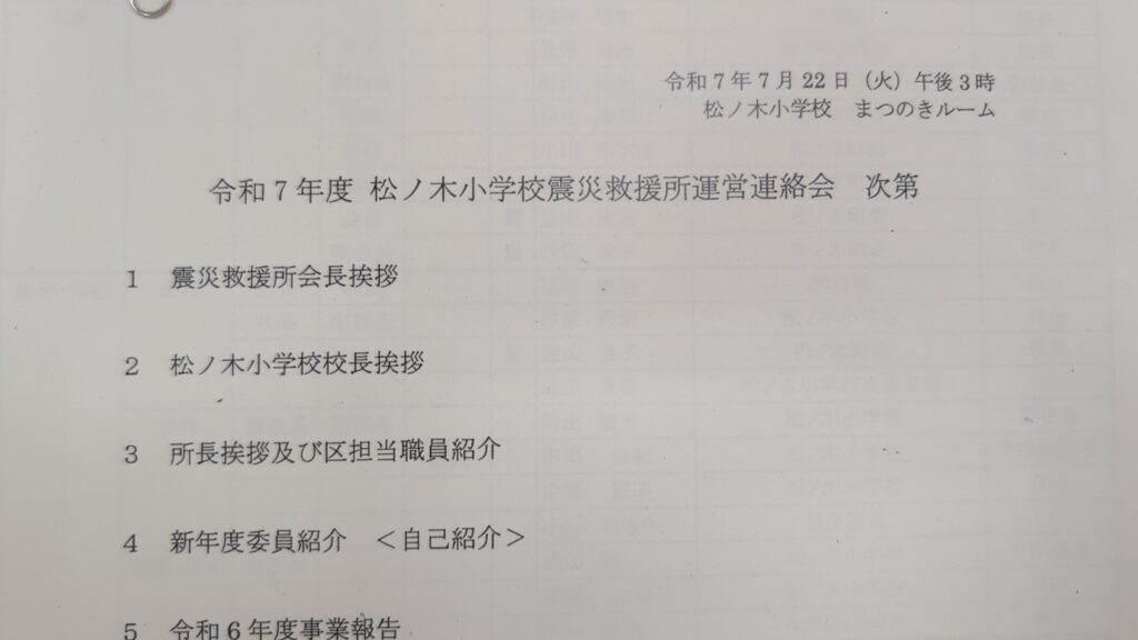 午後には、震災救援所の運営連絡会を開催しました。地域や町会の皆様、防災課、PTA、消防署の方々にご参加いただき、今年度の活動計画や役割分担を確認しました。