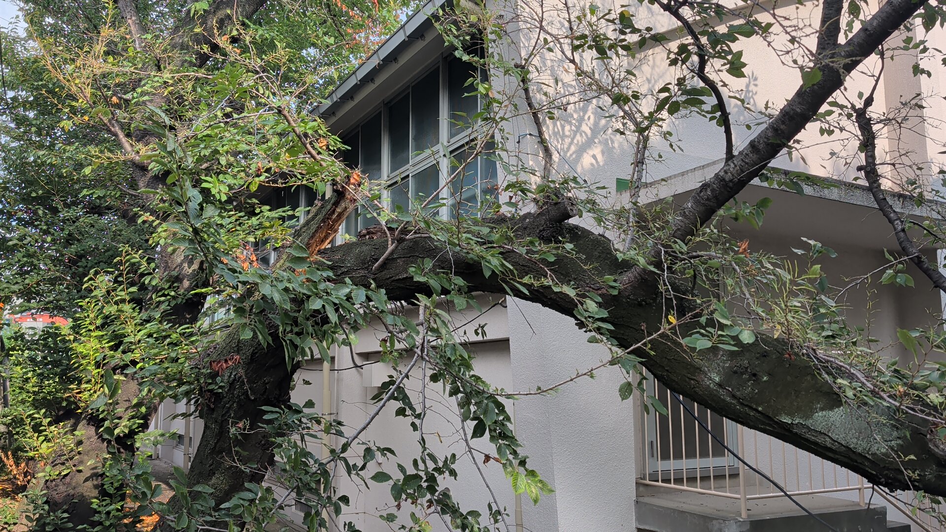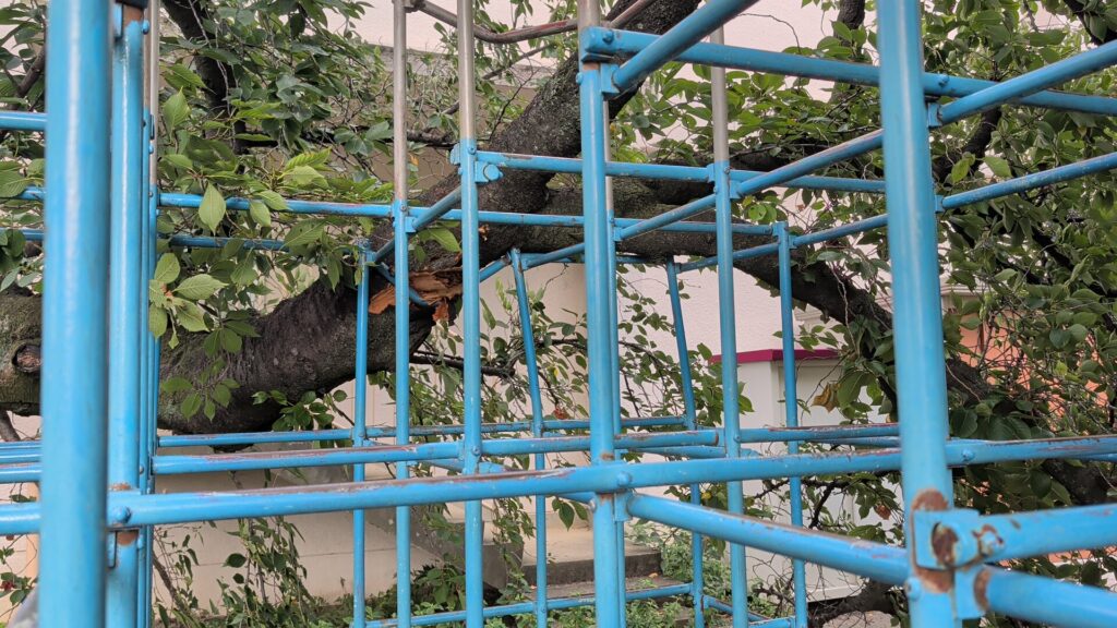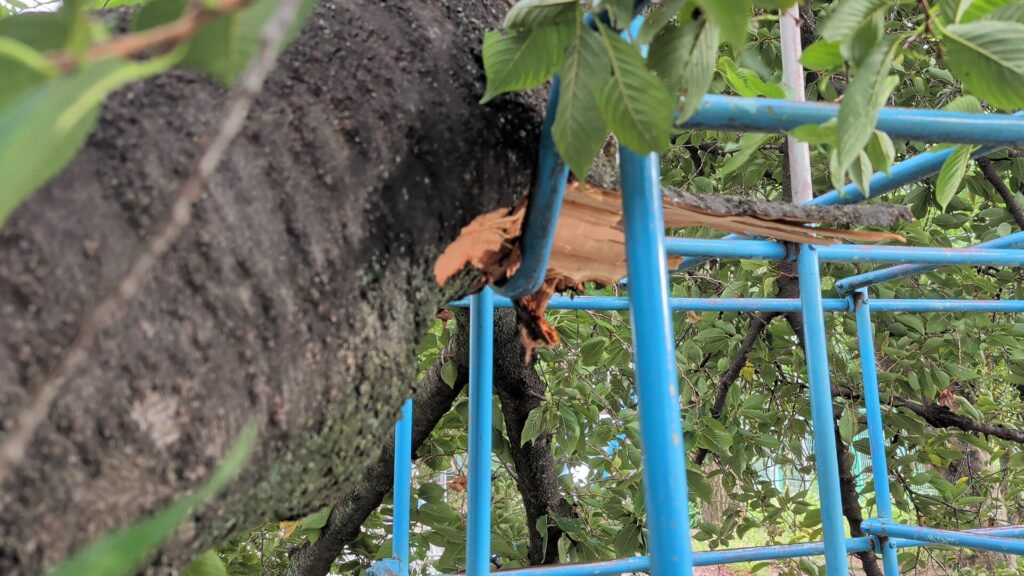 今後、この桜の木は伐採され、ジャングルジムも修繕に入ると思います。時間の経過とともに、身の回りのものが移り変わっていくことは避けられません。今回の件では、夏休み期間という、幸いにも子どもたちがいない時期であり、けが人や電線などへの被害もありませんでした。ジャングルジムが桜の重さを受け止めてくれた形となりました。