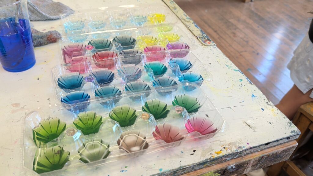 そんな声があちこちから聞こえてきます。透明なコップに、赤や青、黄色が重なり合い、想像以上にきれいな色水が並びました。