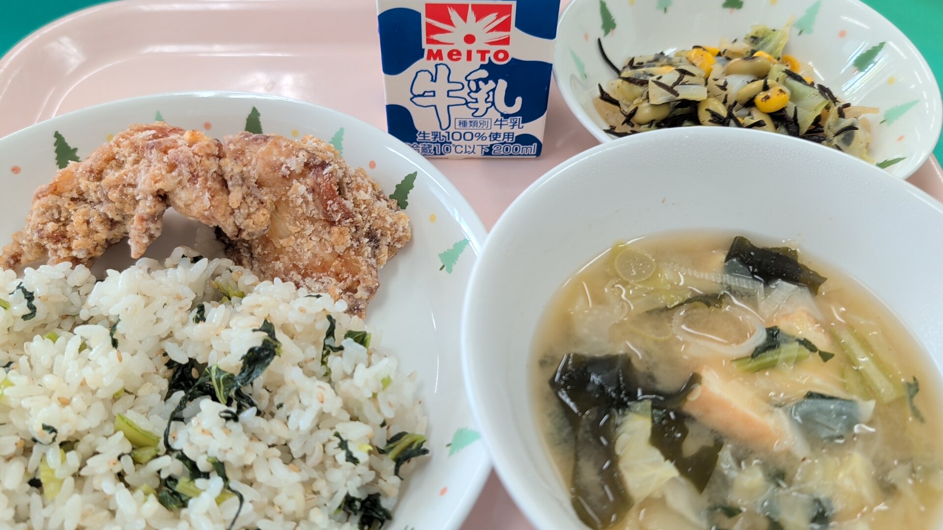 今日の献立は、青菜ごはん、鶏のから揚げ、キャベツとなまあげのみそ汁、ひじきと青大豆のサラダ、そして牛乳でした。