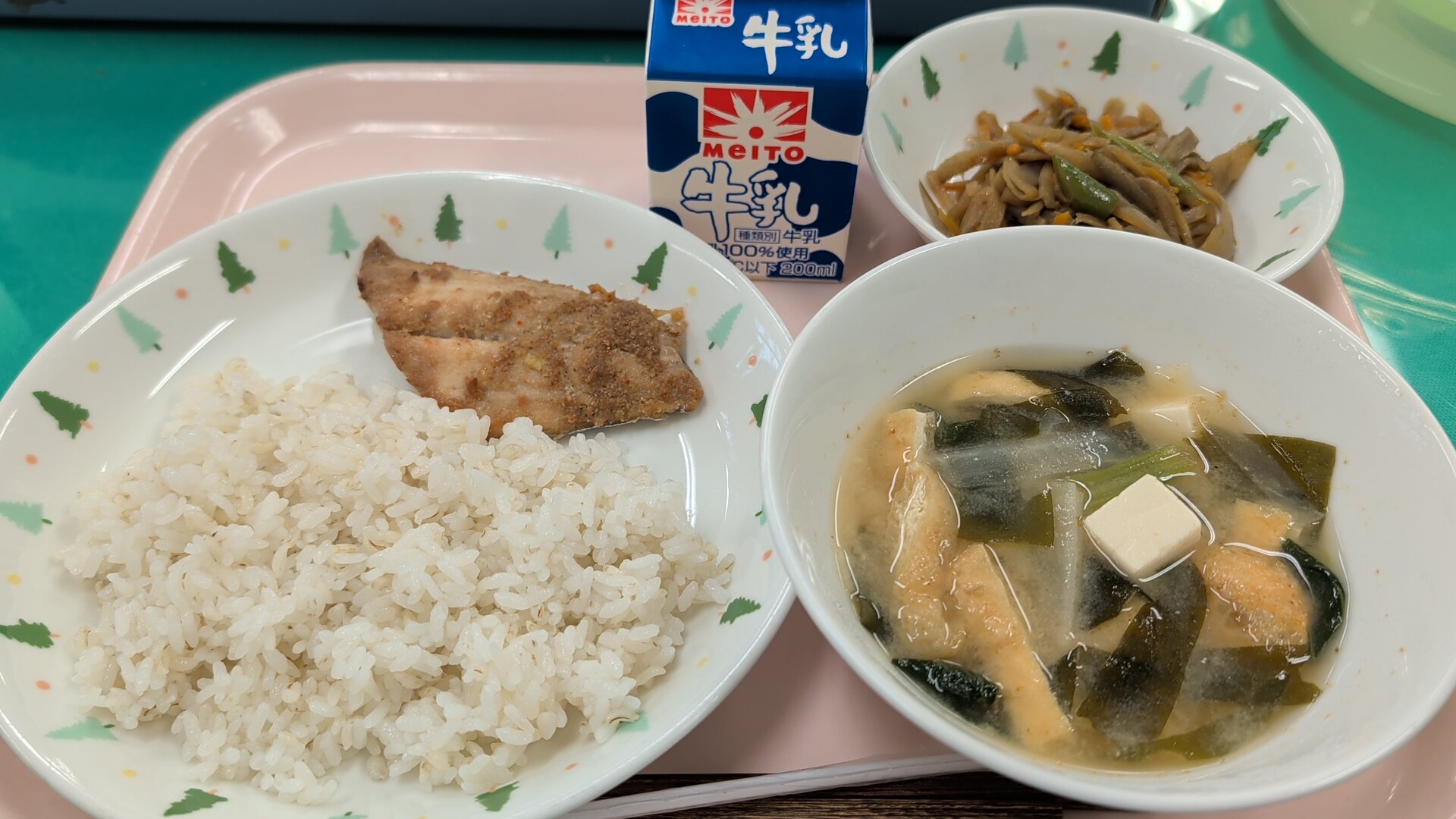 学校全体今日の給食は、麦ごはん、さわらの香味焼き、大根と小松菜のみそ汁、ごもくきんぴら、牛乳でした。