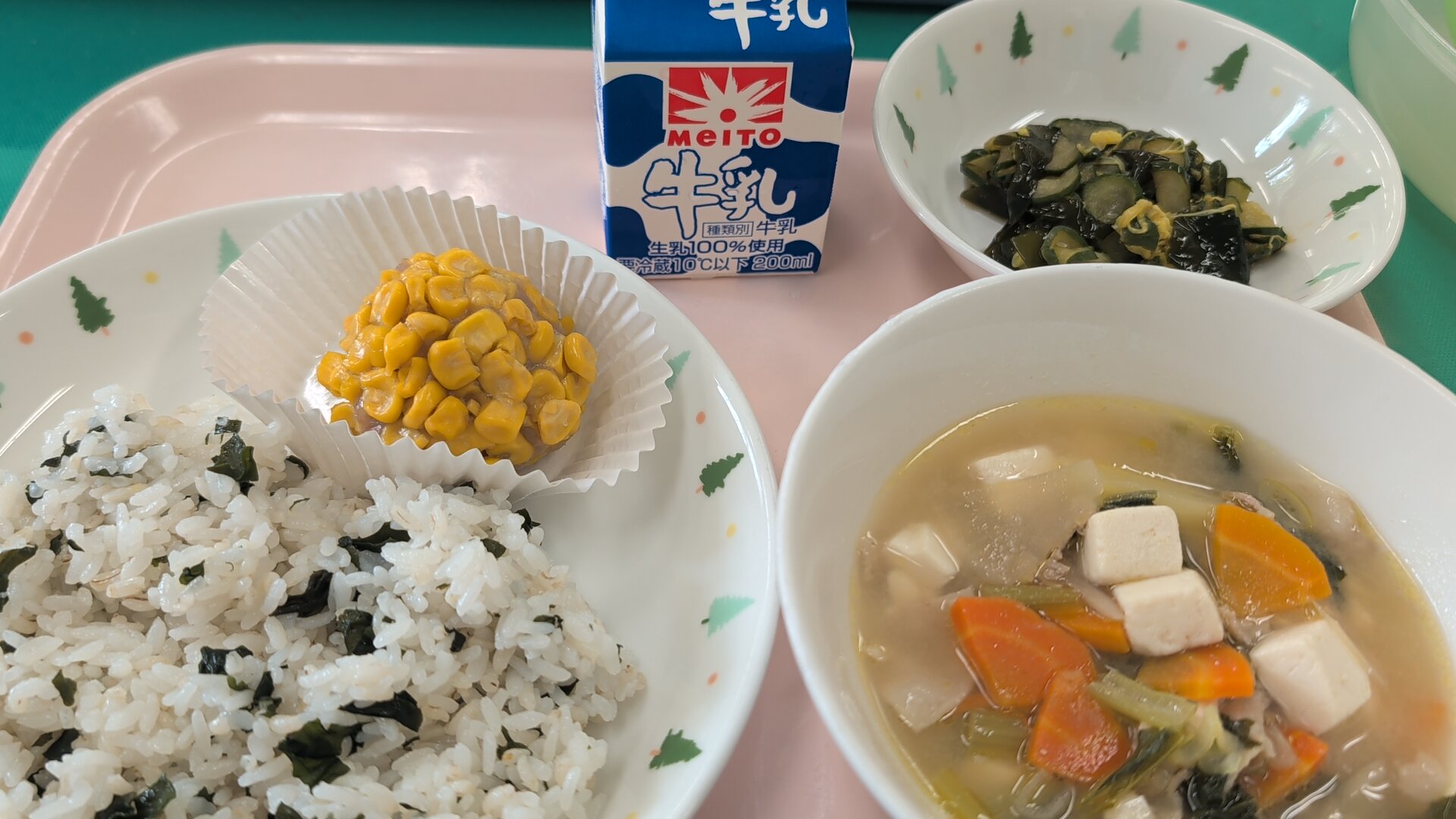 今日の給食は、わかめごはん、きっか蒸し、とん汁、きゅうりの酢の物、牛乳でした。