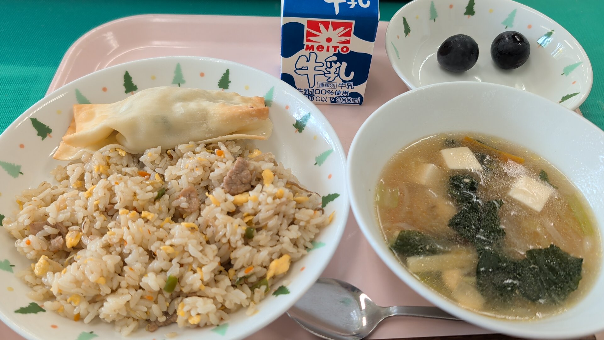 今日の給食は、もやしチャーハン、棒ぎょうざ、中華スープ、巨峰、牛乳でした。