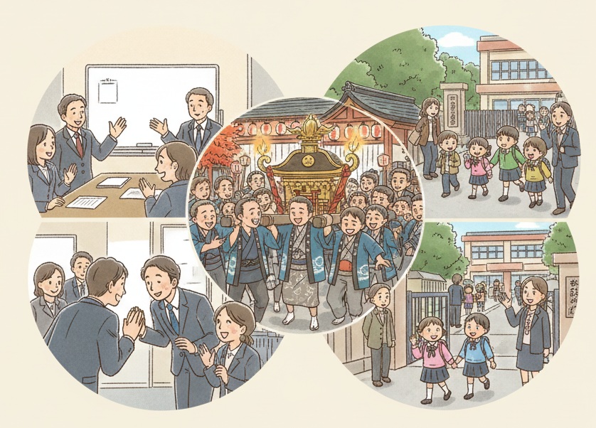 また、昨日は大宮八幡宮の秋の大祭が行われました。境内には七基の神輿が集まり、大変なにぎわいを見せていました。その光景を見ながら、「地域を想い、文化を大切にしようとする人たちの力が、こうした伝統や賑わいを支えているのだ」と強く感じました。ある神輿には、かつて本校で勤務していた堀友主幹教諭の姿もありました。