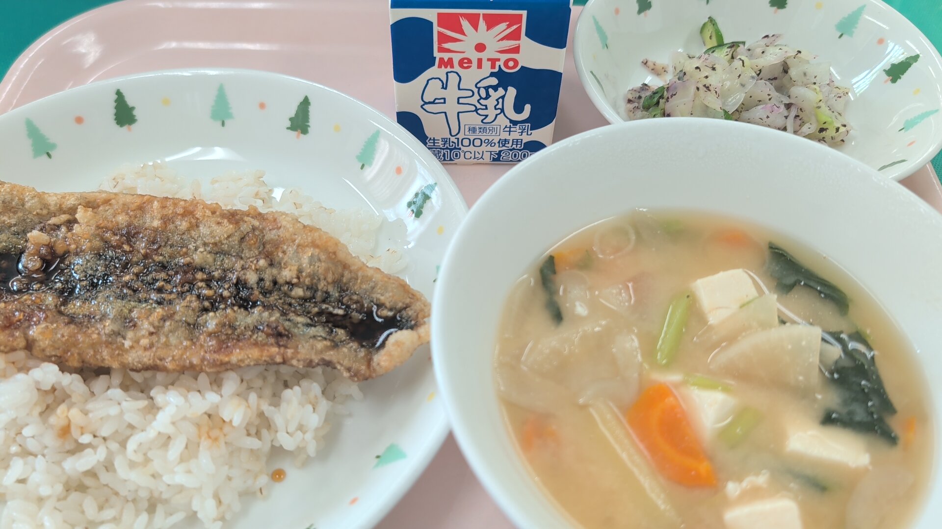 副菜のゆかりキャベツは、さっぱりとした酸味があり、揚げ物とのバランスも抜群。季節を感じる給食に、秋の訪れを感じるひとときでした。
