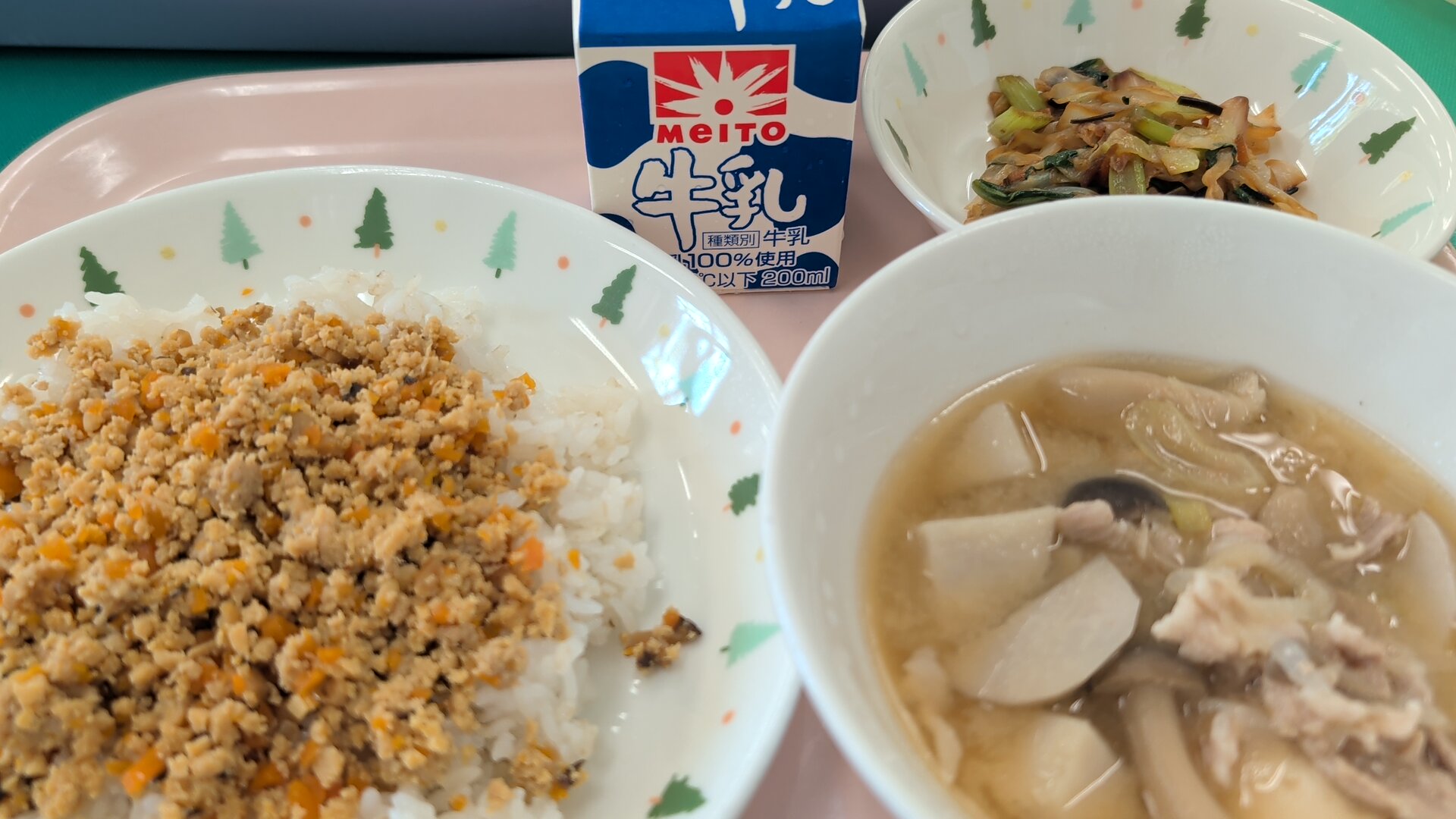 今日の給食は、こうや豆腐のそぼろごはん、しょうないの芋煮、野菜の塩昆布あえ、牛乳です。
