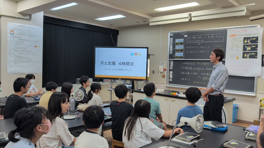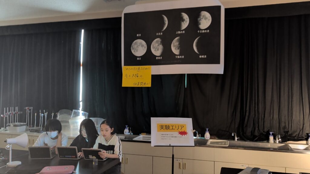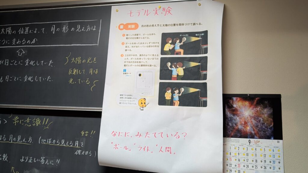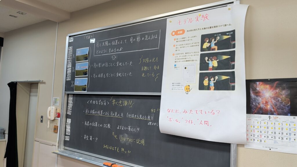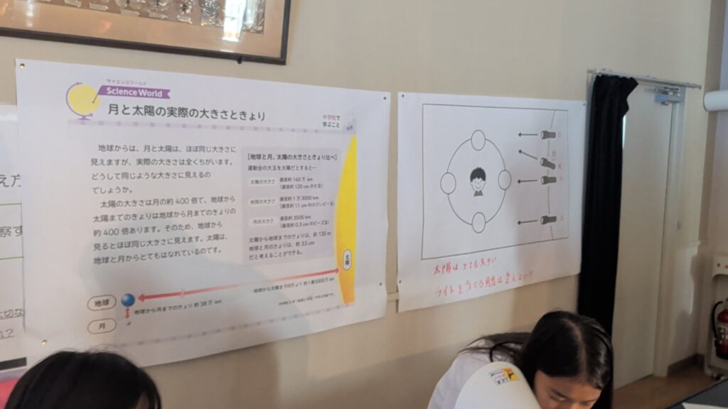 テーマは「月と太陽」。太陽と月の位置関係によって、月の形がどのように見えるのかを、モデル実験を通して探究しました。