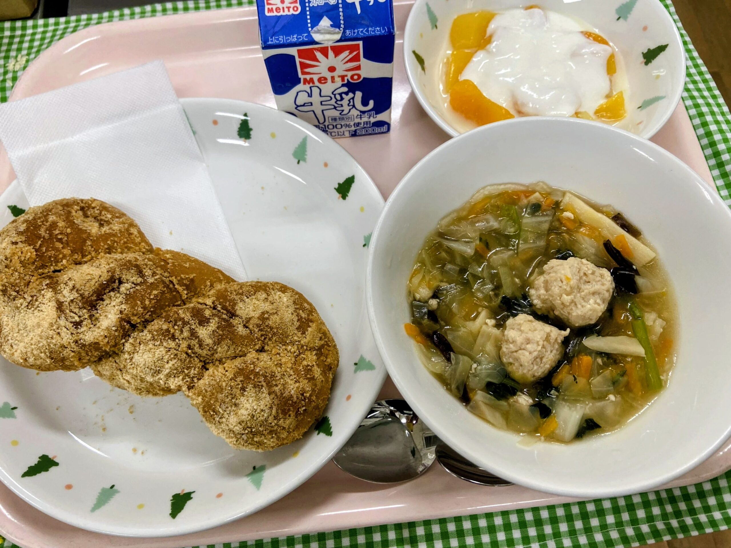 今日の給食は、あしたばきなこあげパン、キャベツと肉だんごのスープ、フルーツのヨーグルトかけ、牛乳です。
