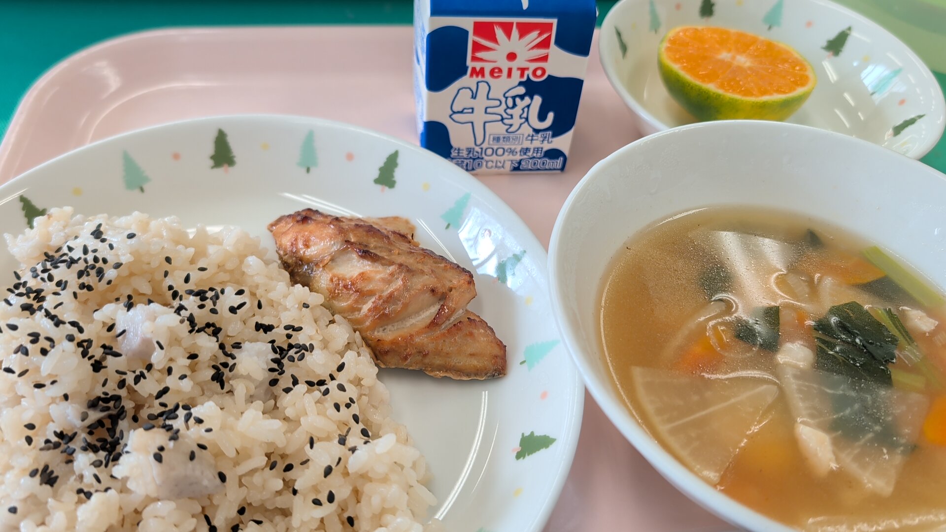 学校全体今日の献立は、里いもごはん、さばの香味焼き、お月見団子汁、そして菊花みかん、牛乳です。