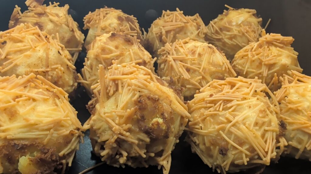 蒸したさつまいもをつぶして砂糖や牛乳で味をつけ、そうめんを衣のようにまとわせて揚げた料理です。見た目が栗にそっくりで、まさに今の季節にぴったりの一品でした。