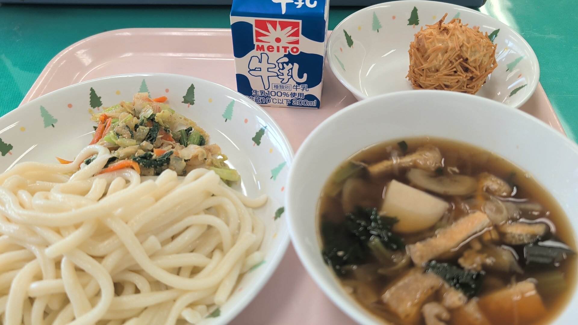 今日の給食は、けんちんうどん・野菜のごまだれあえ、いがぐり揚げ、牛乳でした。