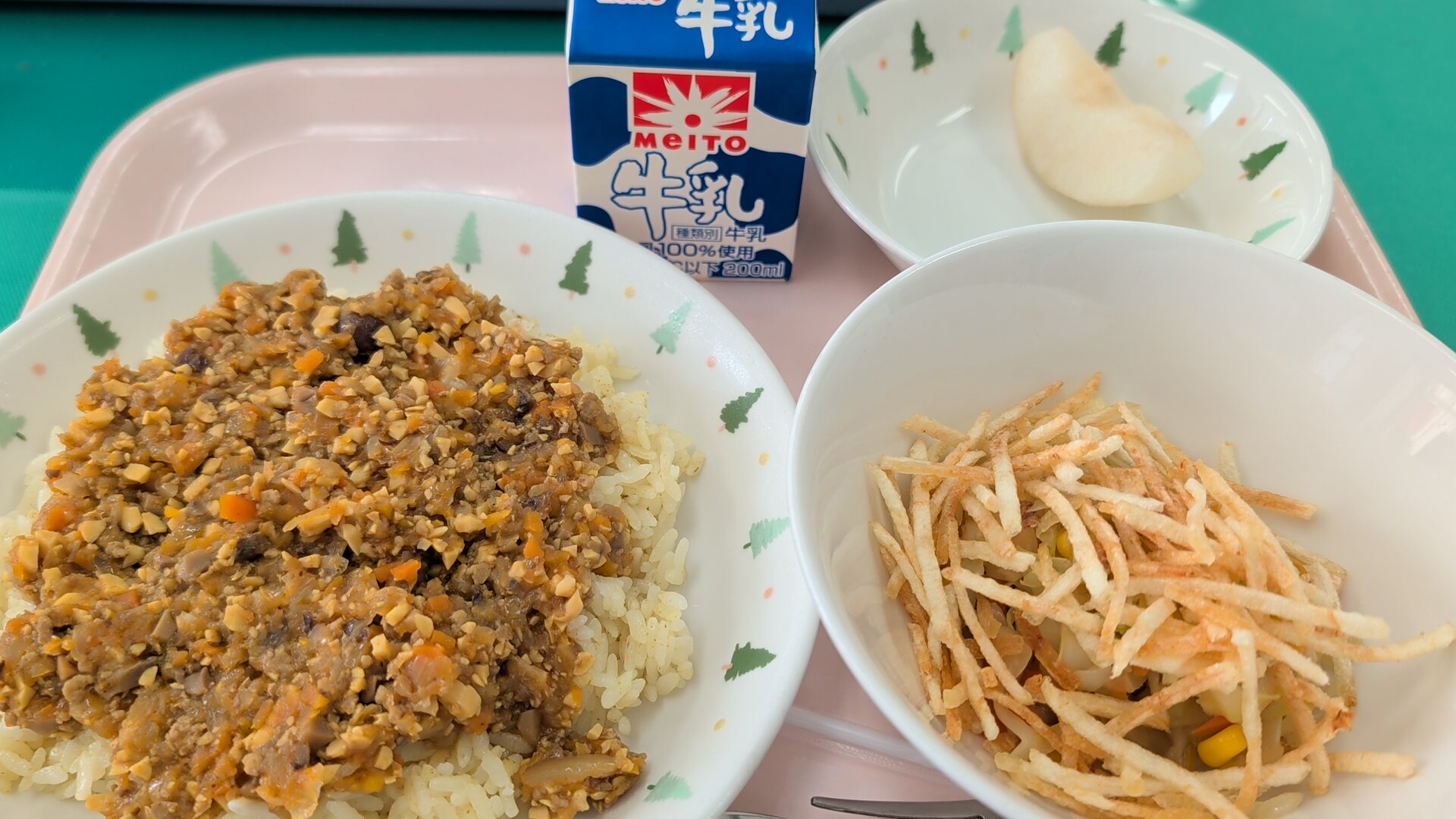 今日の給食は、大豆入りドライカレー、サウピカンサラダ、なし、牛乳です。
